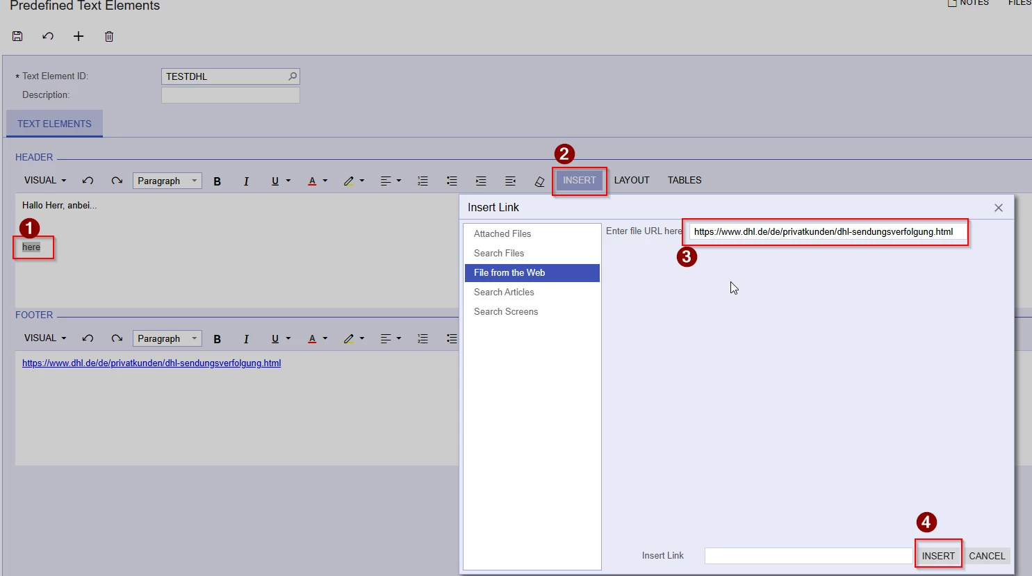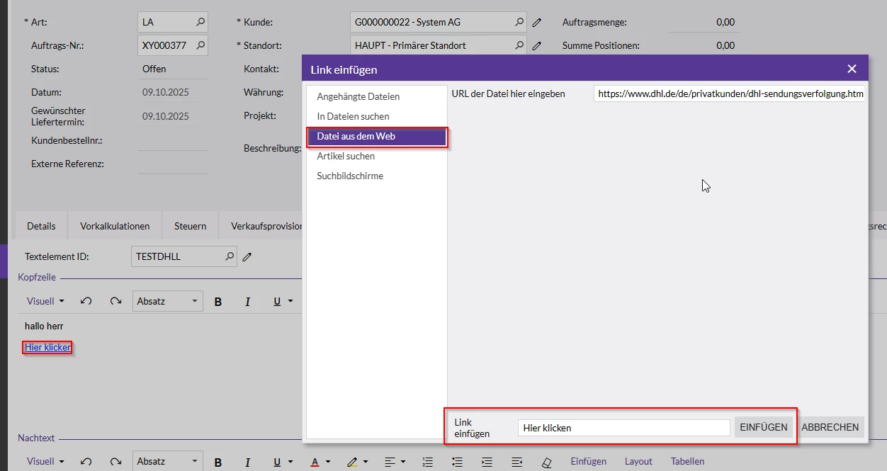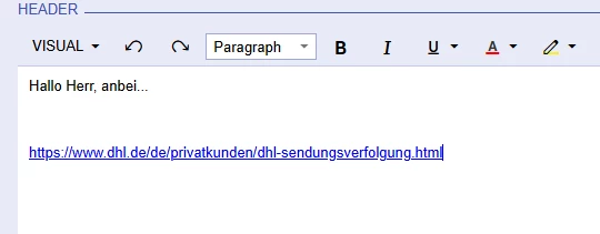 the customer would like to put an hyperlink into a word, in an predefined text element. He wishes to set an sentence like “… klick here...” and the “here” should contain the link.