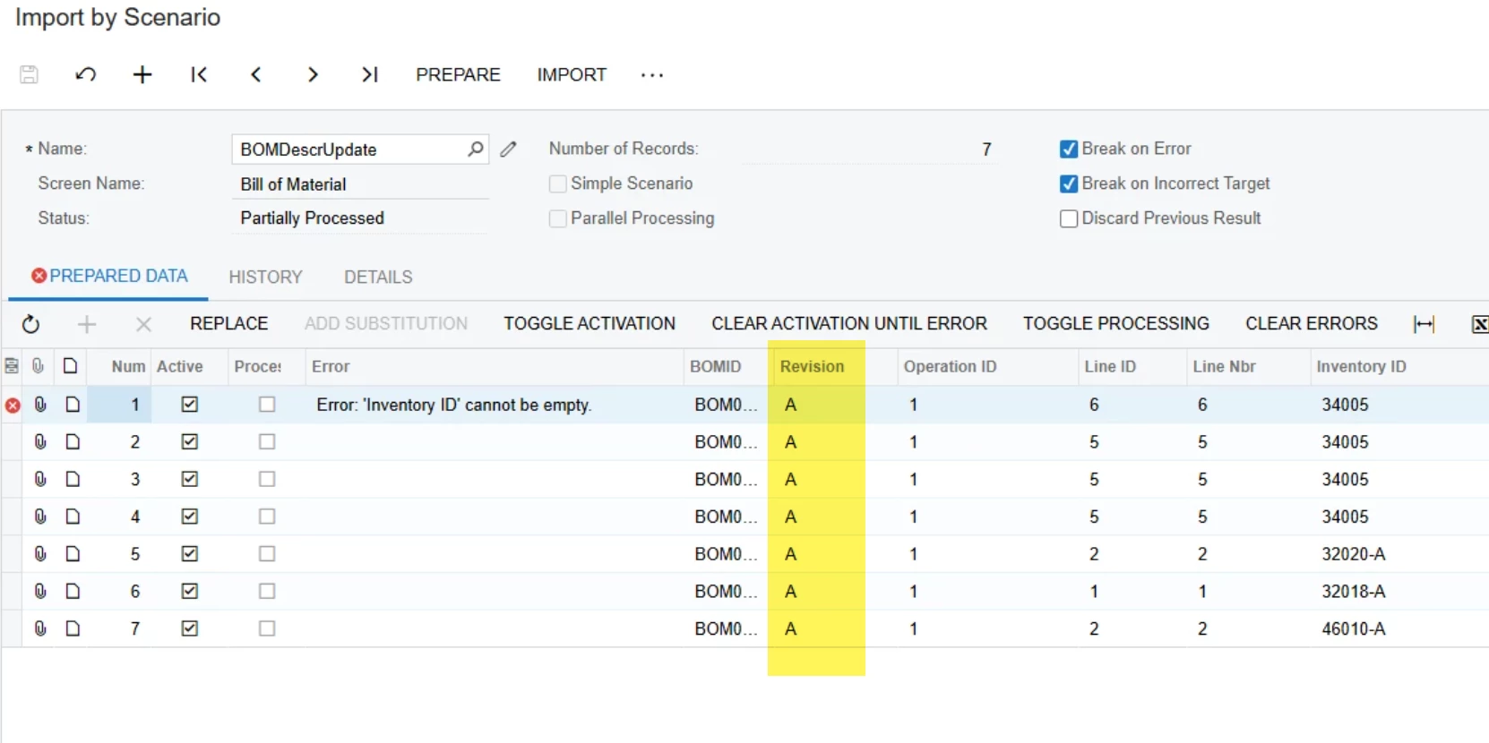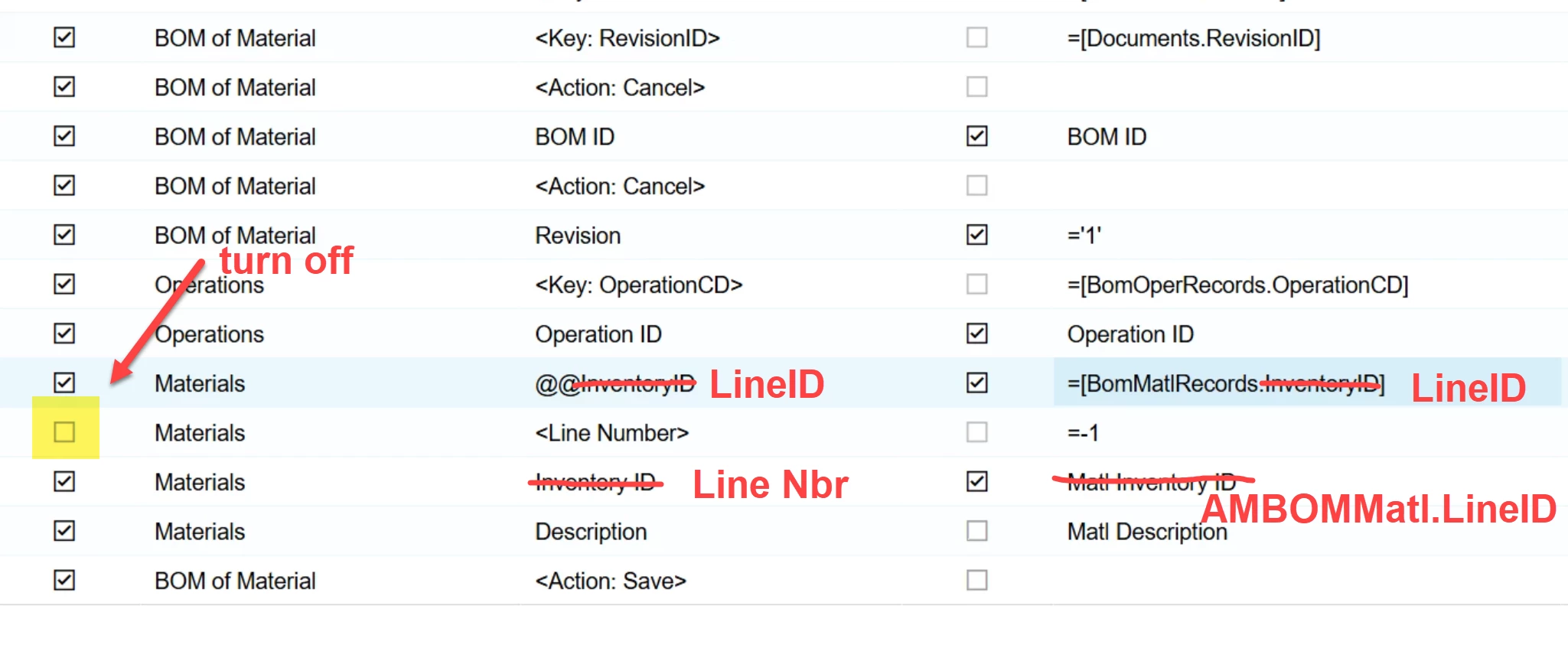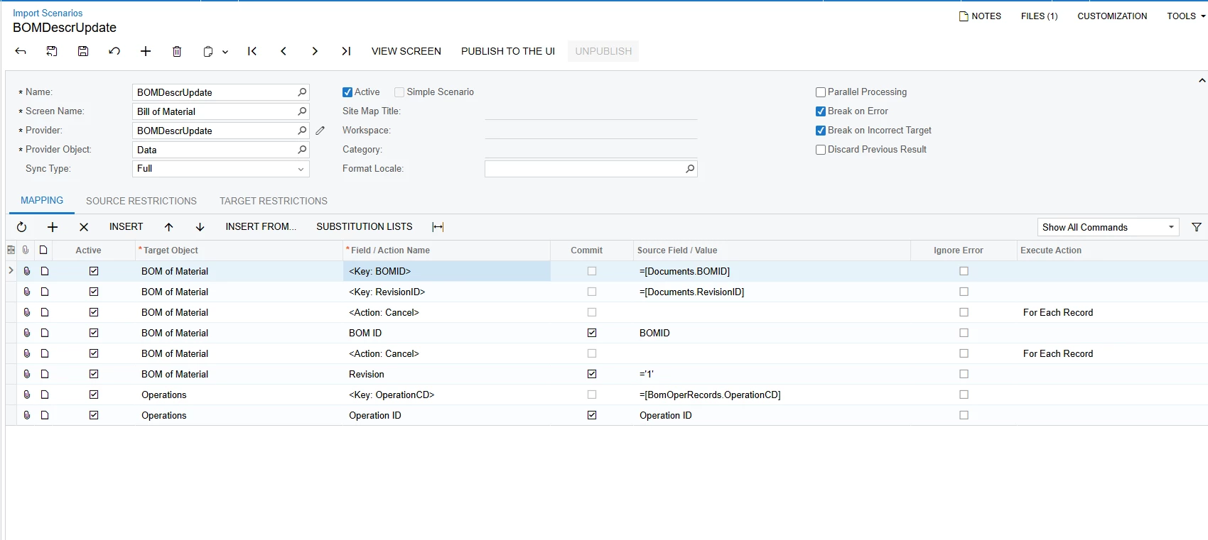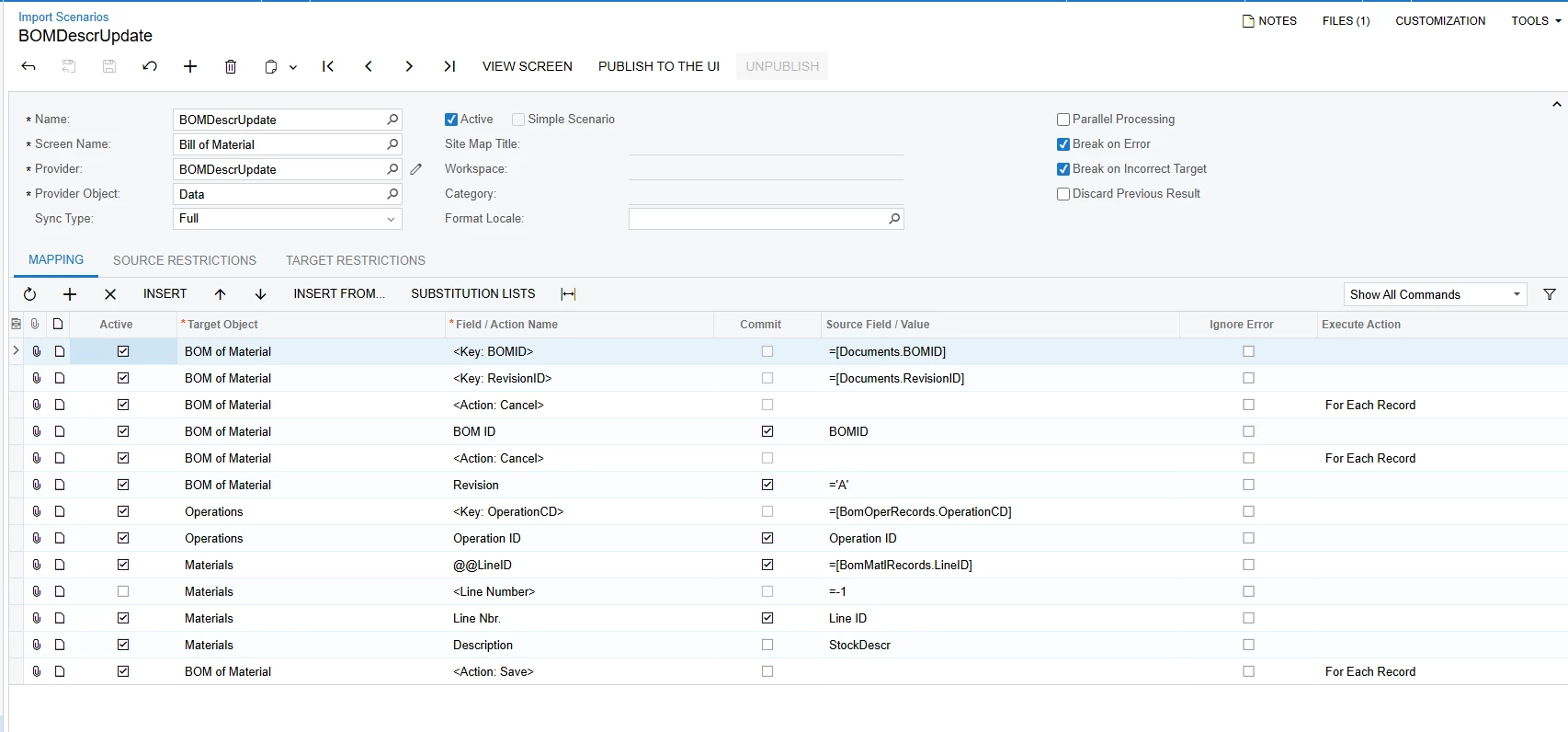The import scenario should look like below. replace the =’1’ for the revision field with the revision ID from the GI. The @@InventoryID allows us to use the inventory ID as a key field. For the best results, you should actually use @@LineID or @@LineNbr where they equal [BomMatlRecord.LineID], but in the example below I used Inventory ID. Using Inventory ID will fail if the same inventory ID exists multiple times under the same operation, which is why line number is better, Make sure <Line Number> is turned off. This prevents a new line being created. Replace Matl Description with InventoryItem.Descr as that is the correct description you want to update the material line with.