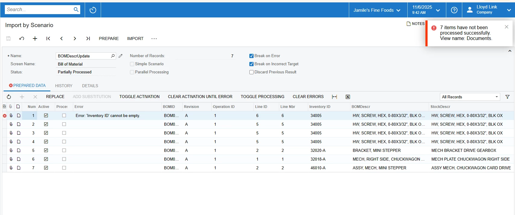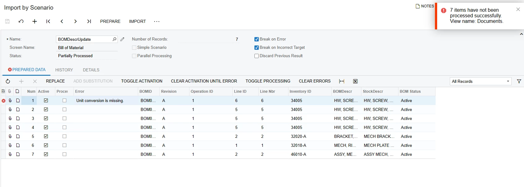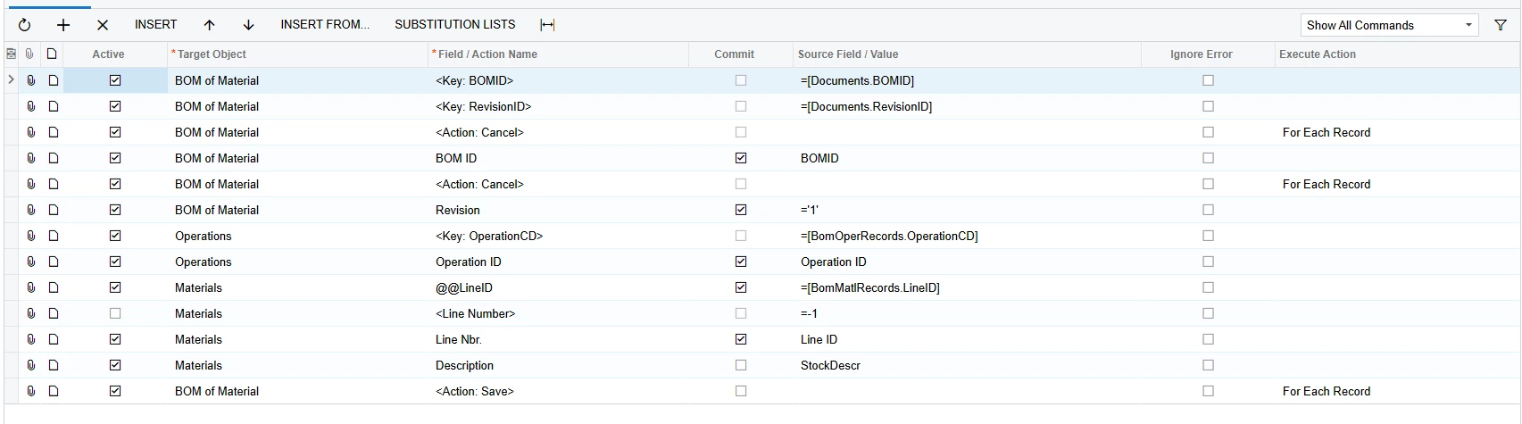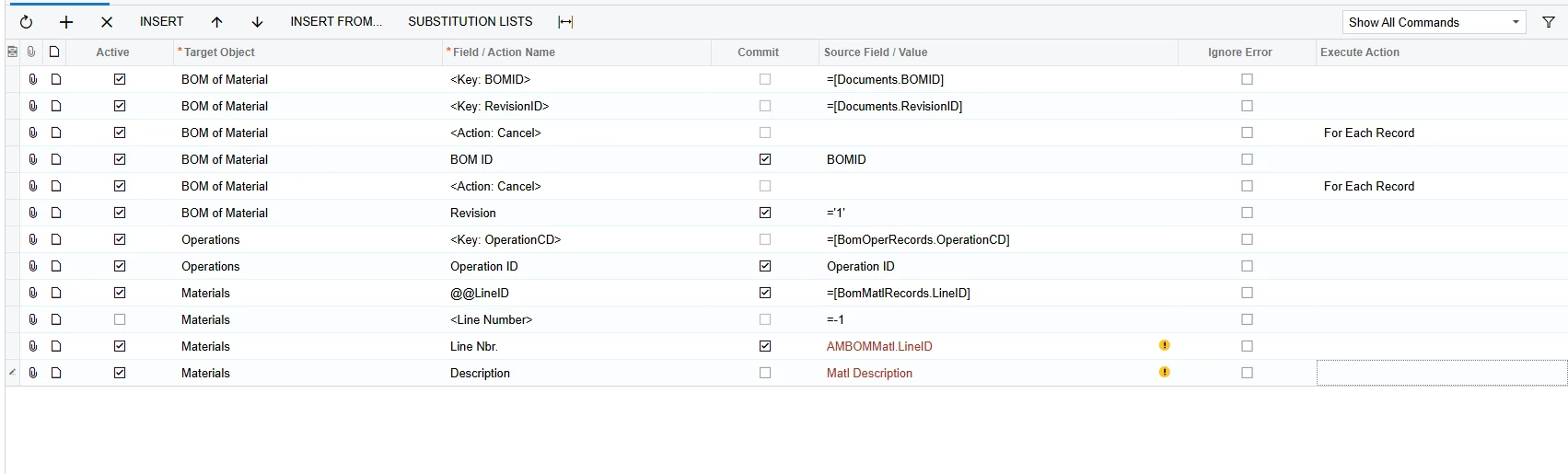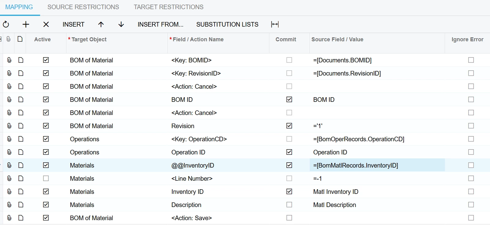 The import scenario should look like below. replace the =’1’ for the revision field with the revision ID from the GI. The @@InventoryID allows us to use the inventory ID as a key field. For the best results, you should actually use @@LineID or @@LineNbr where they equal [BomMatlRecord.LineID], but in the example below I used Inventory ID. Using Inventory ID will fail if the same inventory ID exists multiple times under the same operation, which is why line number is better, Make sure <Line Number> is turned off. This prevents a new line being created. Replace Matl Description with InventoryItem.Descr as that is the correct description you want to update the material line with.