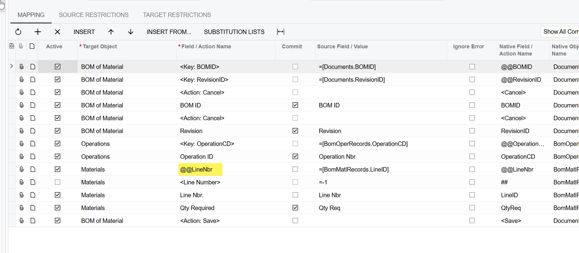 You have to type out @@LineID. It’s not something that shows up in the drop down. For the source/field value, you can click the pencil, click internal field, and then find [BomMatlRecord.LineID] or you can just type it out.