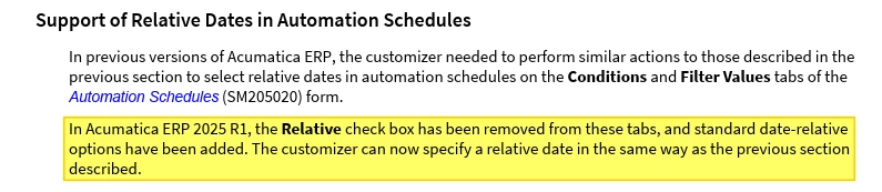 In 24R1 I could use the Relative checkbox to adjust the period. In 25R1 Acumatica got rid of the box and says the date-relative options can be used, but I can’t enter @PeriodEnd in the Filters to Apply tab.