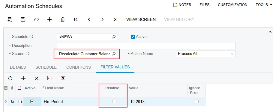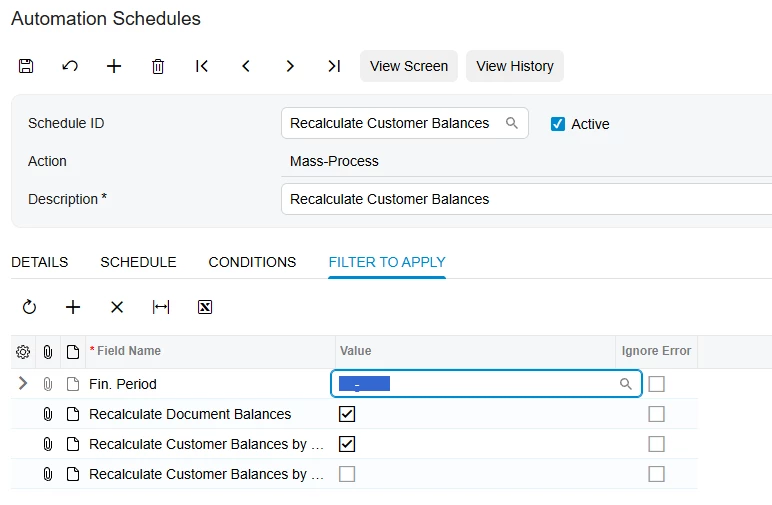 I’m trying to set an Automation Schedule for the Recalculate Customer Balances mass-process screen. The client hasn’t locked any periods, so the filter defaults to the first period in the system.