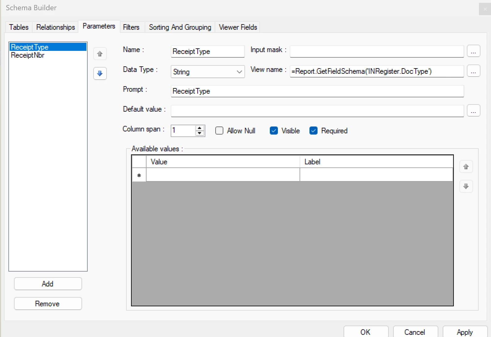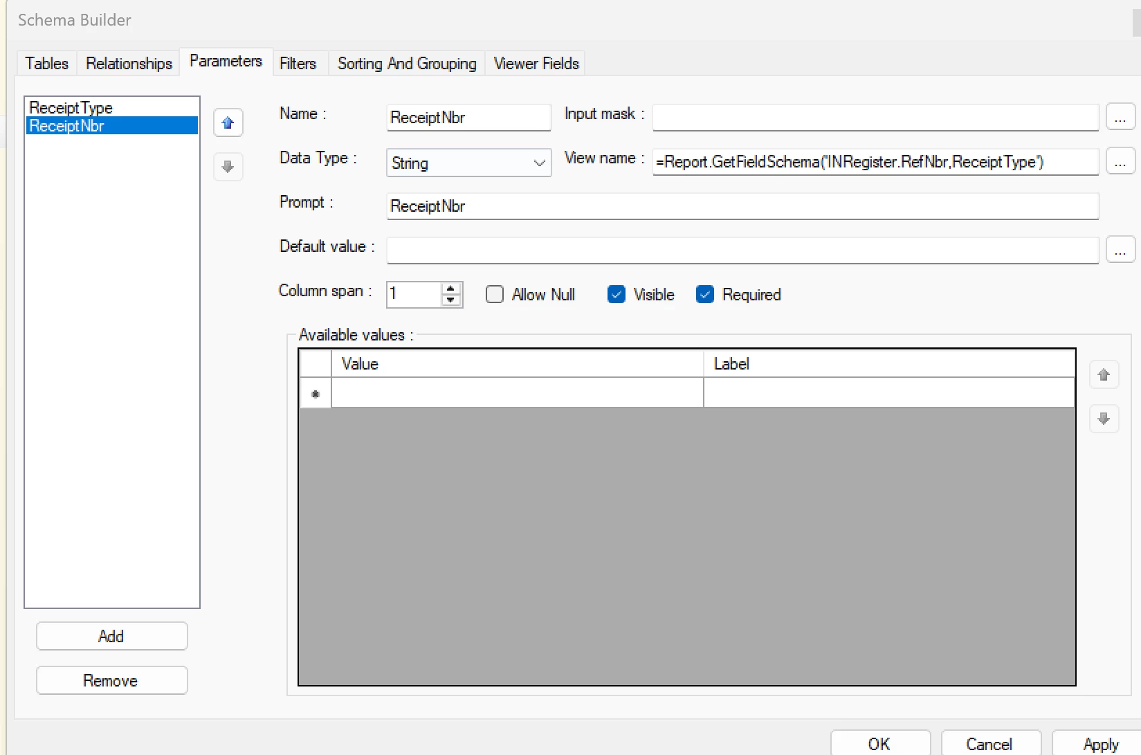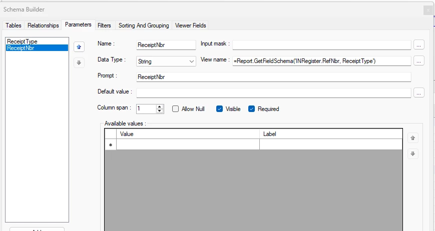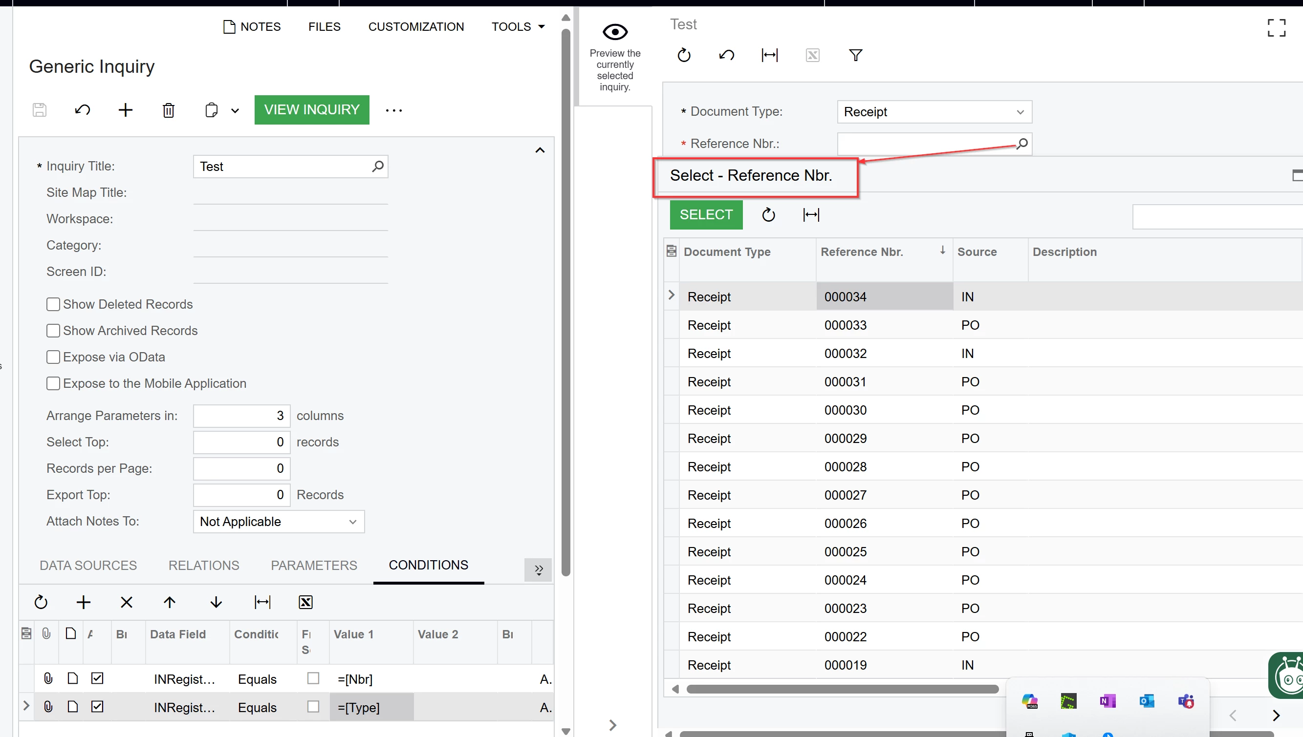 I am trying to add parameters to a report for Inventory Transfers. I need to add DocType and RefNbr. I have run into this issue before, but the DocType allows me to select from the dropdown of Document Types; however, I cannot get the RefNbr to do a lookup of the Reference Numbers.