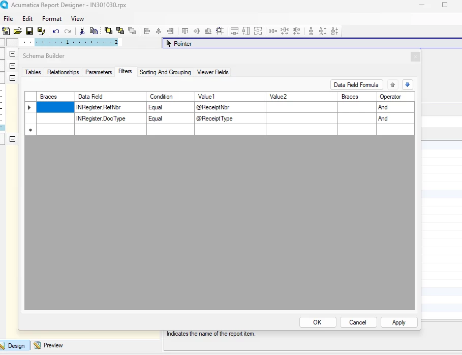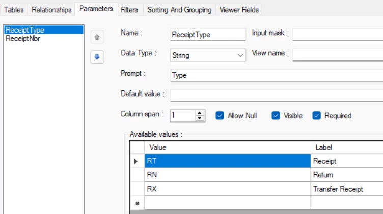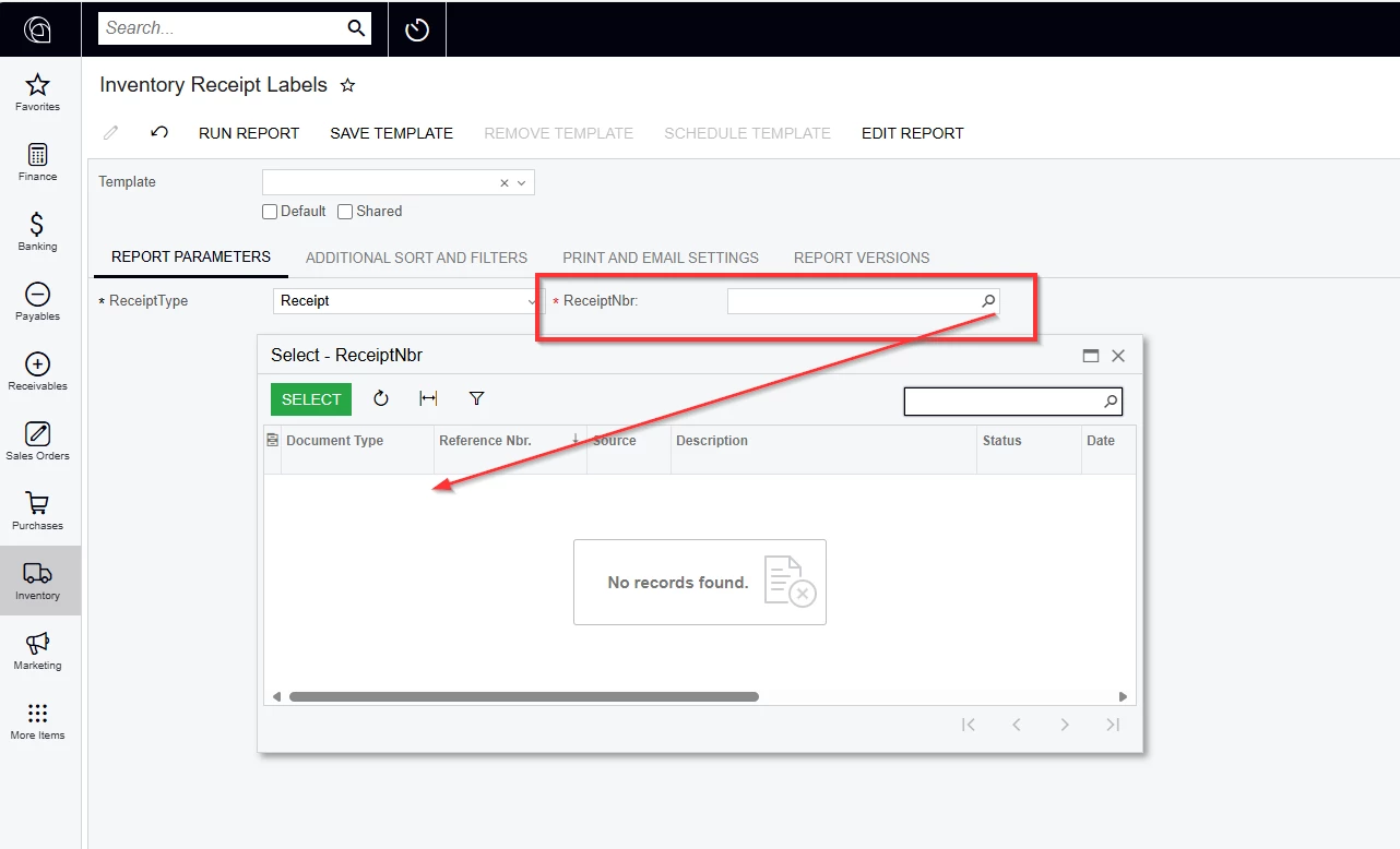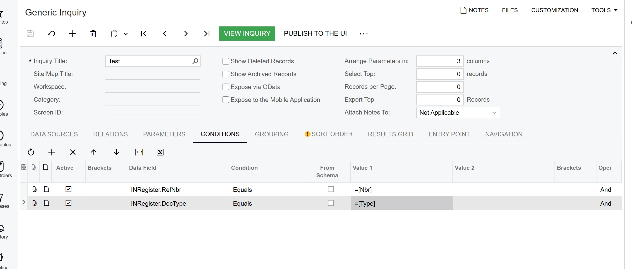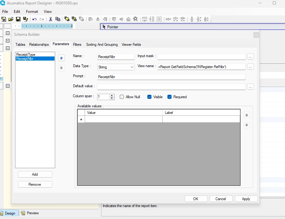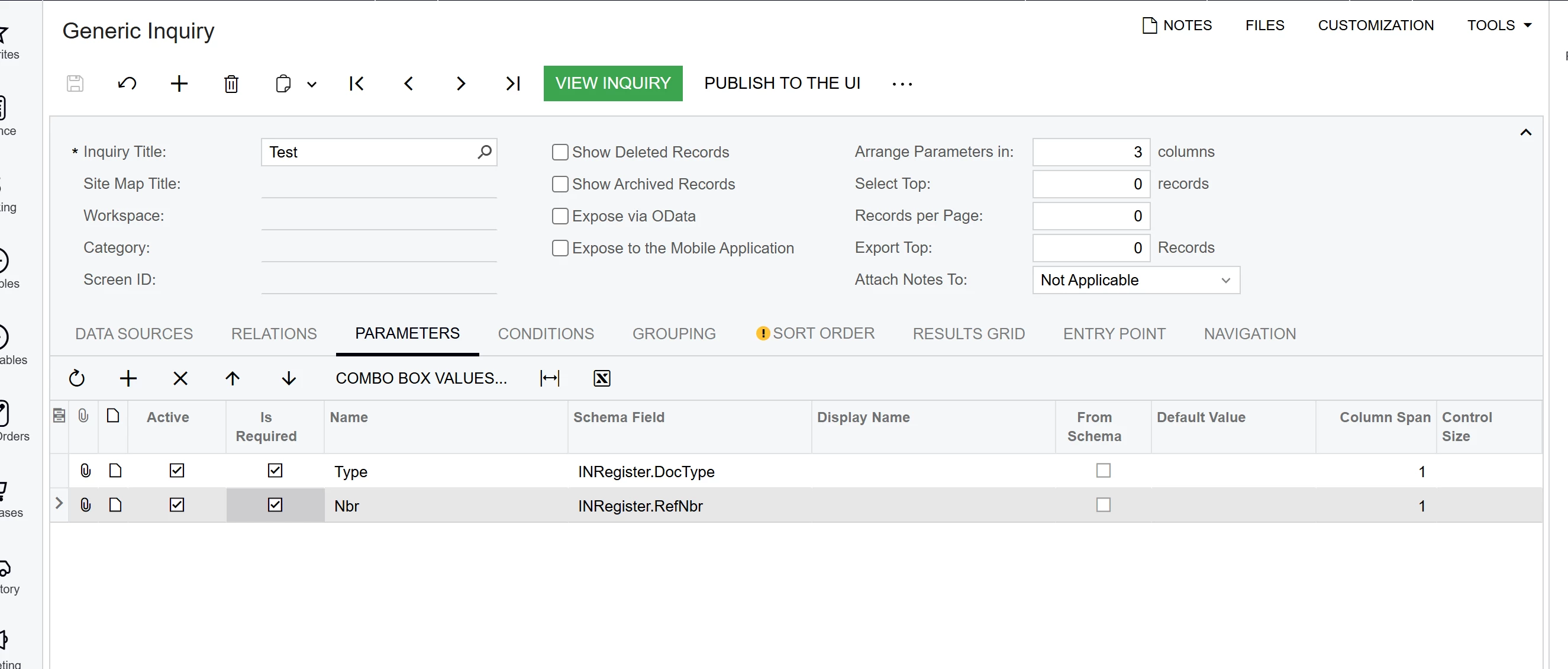 I am trying to add parameters to a report for Inventory Transfers. I need to add DocType and RefNbr. I have run into this issue before, but the DocType allows me to select from the dropdown of Document Types; however, I cannot get the RefNbr to do a lookup of the Reference Numbers.