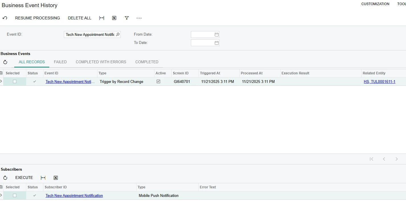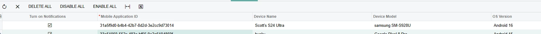 Here is a test notification I created that fires successfully, but no notification is received. We tested with multiple mobile devices, all with the notifications turned on for the Acumatica app, but nothing is received and the system shows no errors??