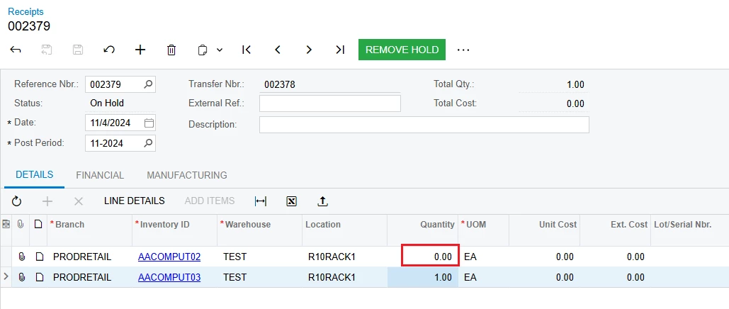 Is there any way we can remove few lines from the Transfer Reciept when processing 2-step Transfer method. I tried to remove few item lines but delete (X) icon is freezed.
