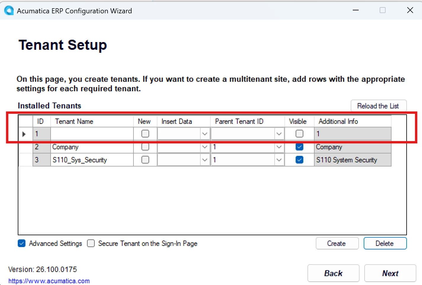 During instance setup, a tenant is created based on the data imported or selected during configuration. By default, a Company tenant is created.