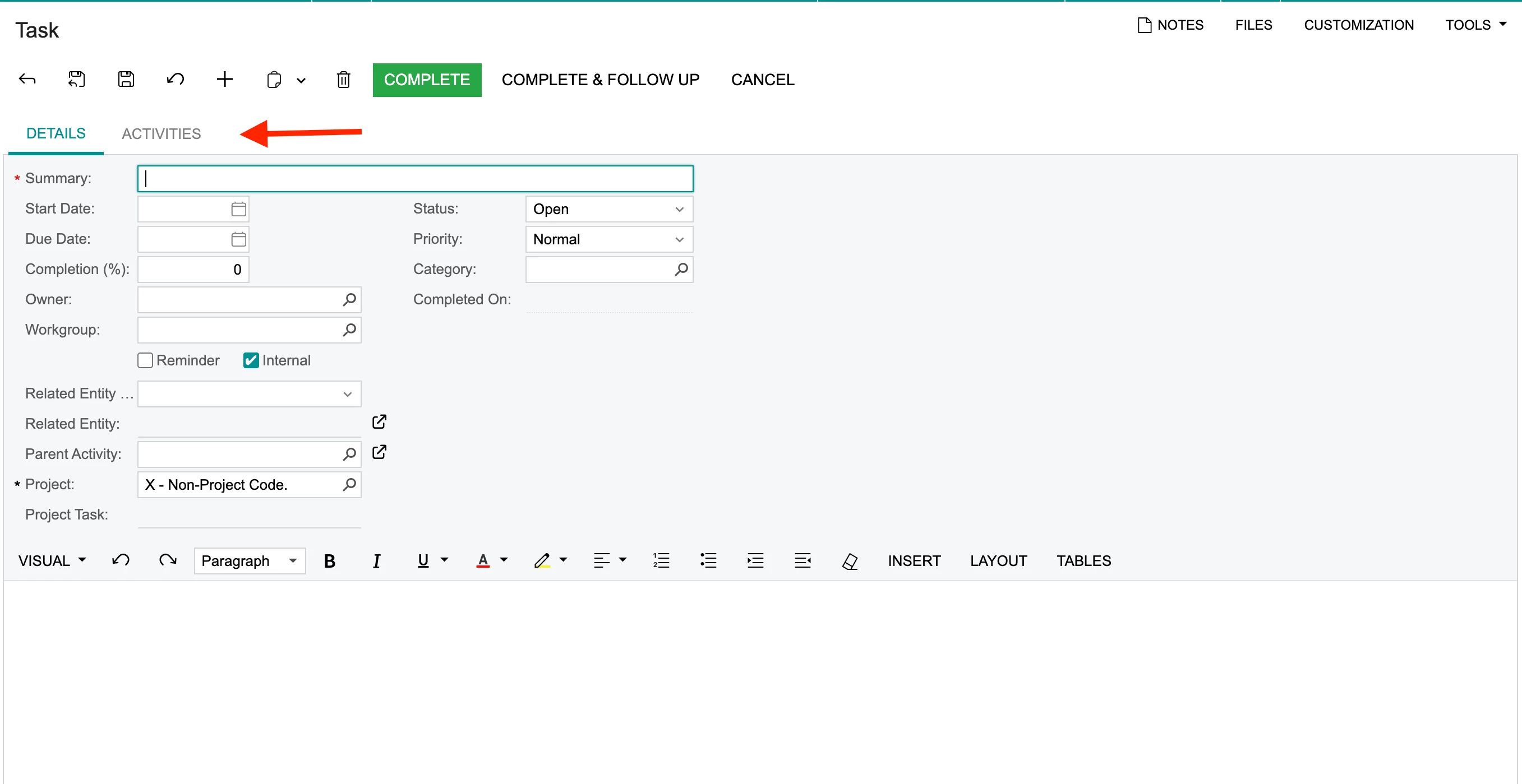 Is there a way to set up a default task in acumatica that has preset sub tasks?
