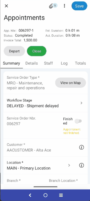 Is it possible to update the workflow stage of an appointment from the mobile app? Currently when items are added to an appointment, we change the workflow stage of that appointment to “Parts Requested”. Doing this generates a picklist for our warehouse persons to gather the items for the technician to collect. When the items are collected the workflow status is chnaged to fulfilled and the line items are marked as completed. In the mobile app I don’t see the ability to chnage the workflow stage manually. Is this possible?