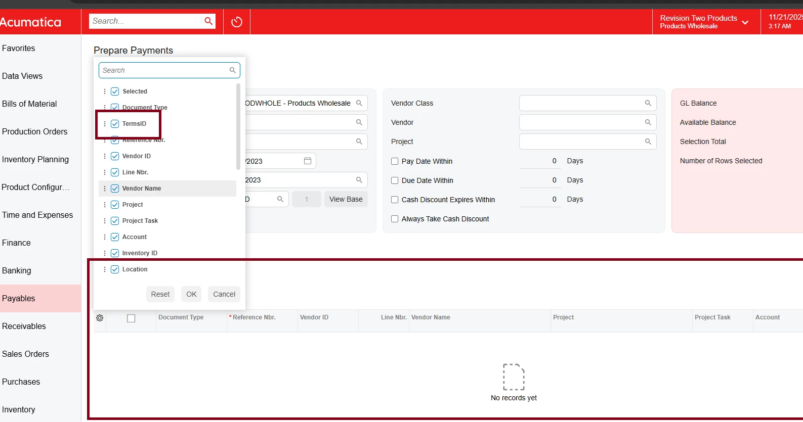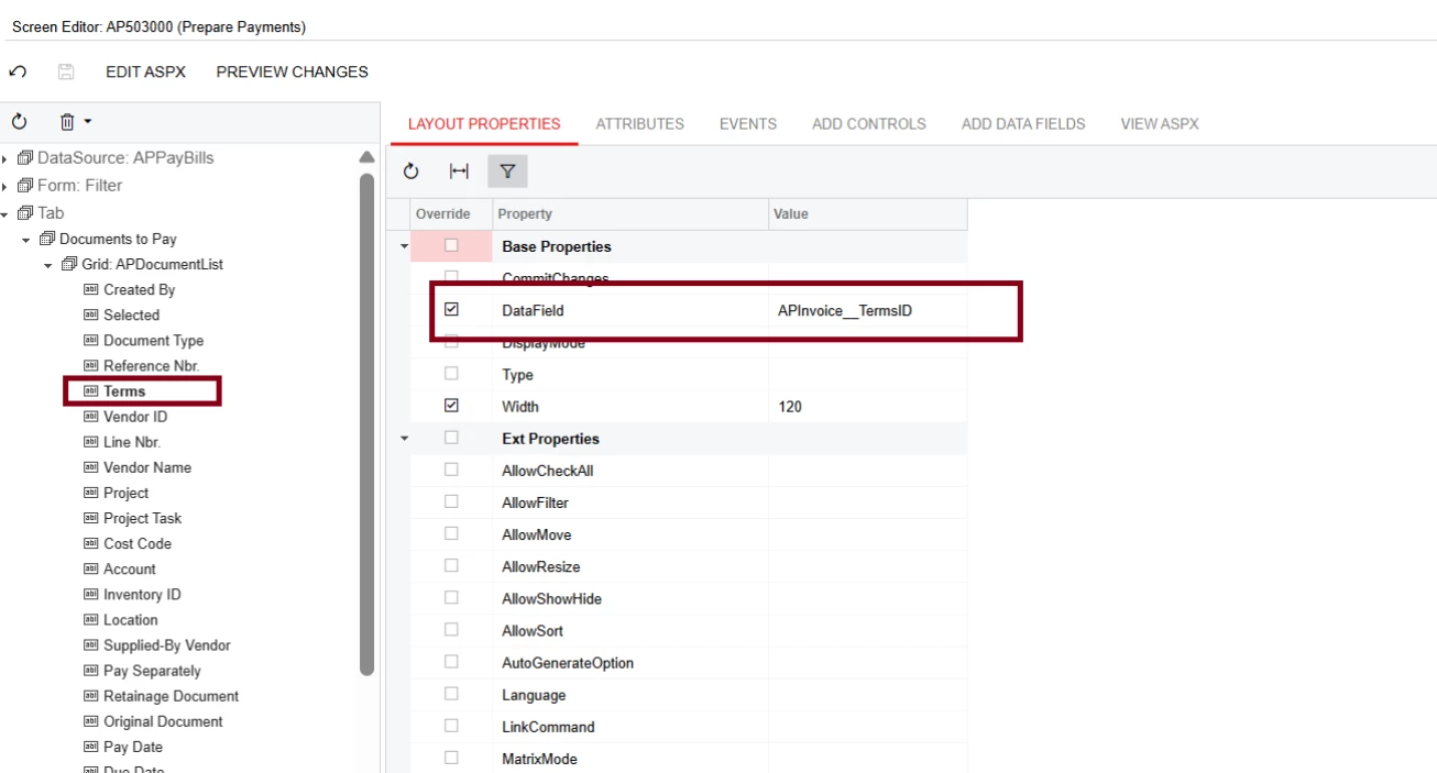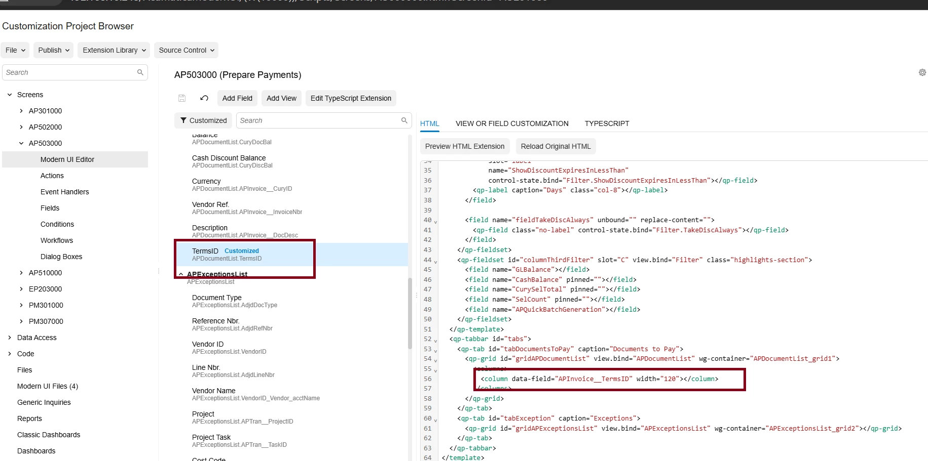 In Acumatica 25R2, I successfully added the Terms field to the "Approve Bills for Payment" screen using the new modern UI. However, when I try to add the same Terms field in the "Prepare Payments" screen, the field does not appear.
