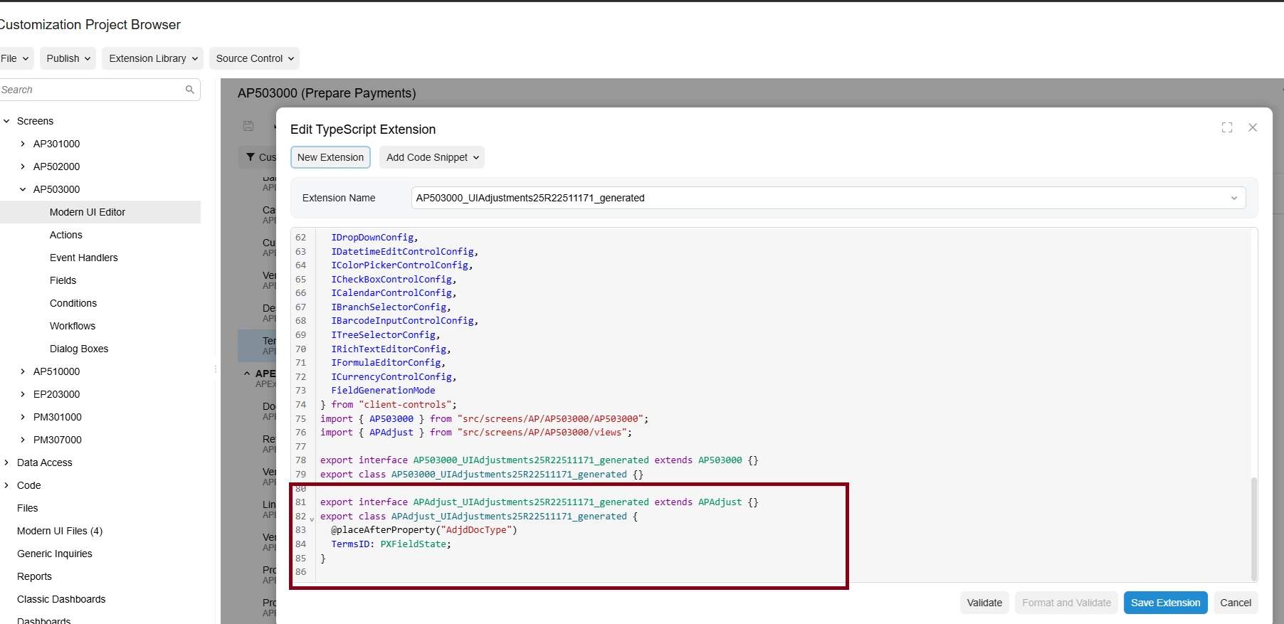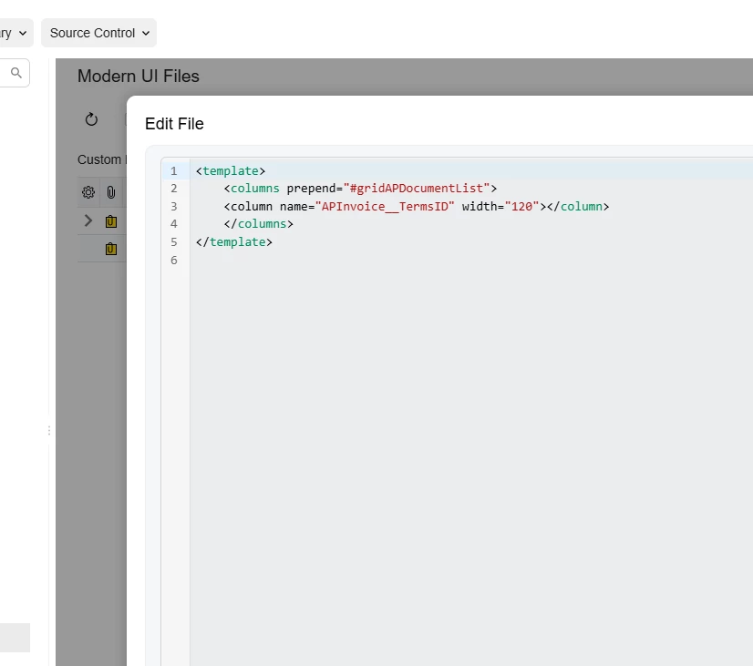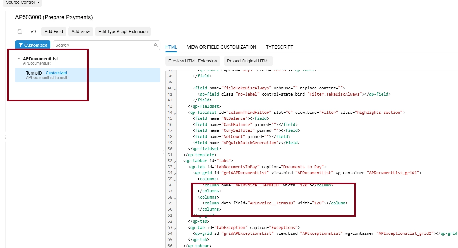In Acumatica 25R2, I successfully added the Terms field to the "Approve Bills for Payment" screen using the new modern UI. However, when I try to add the same Terms field in the "Prepare Payments" screen, the field does not appear.