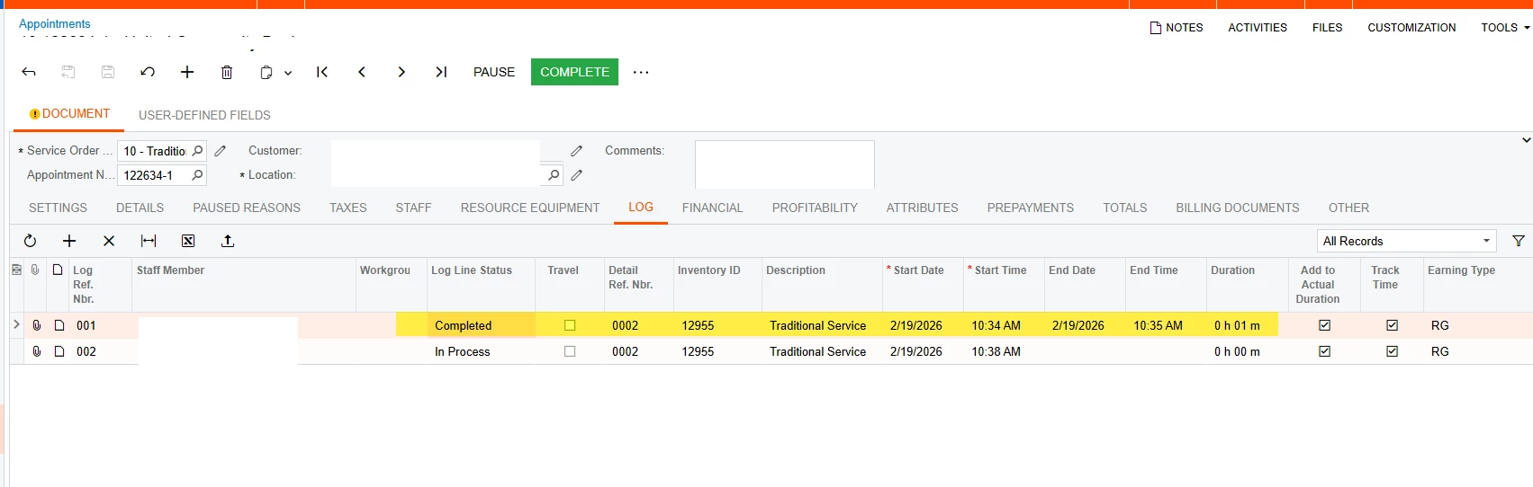 To prevent incorrect long-duration entries and avoid completion-blocking scenarios, the system no longer updates/creates the Employee Time Activity/Time Card immediately upon pause in the same way it did in 23R2. Instead, it updates at a safer point (for example, once the appointment/log is completed and the system can correctly generate/split entries as needed).