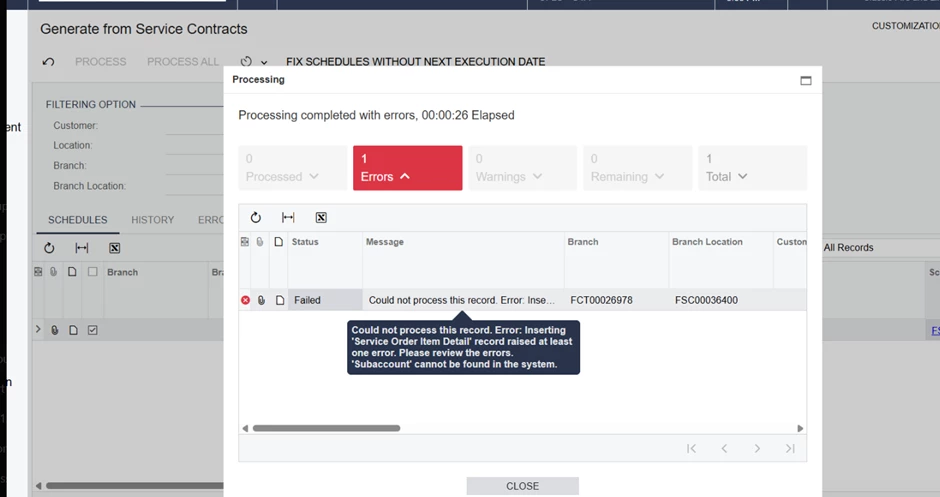 The issue is that they are trying to create a service order from schedule #FSC00036400. By using the following screen:
