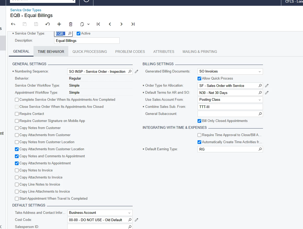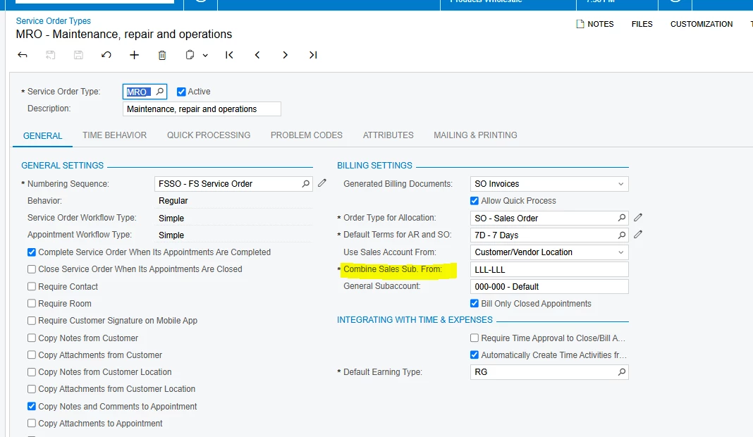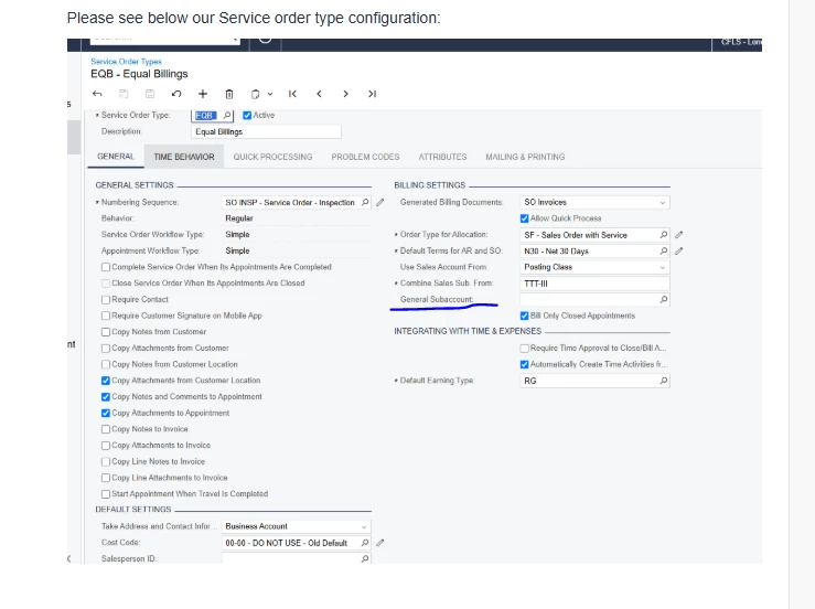 T: The subaccount associated with the service order type. The subaccount of the service order type is specified in the Subaccount box on the current form (also in the Billing Settings section on the General tab).