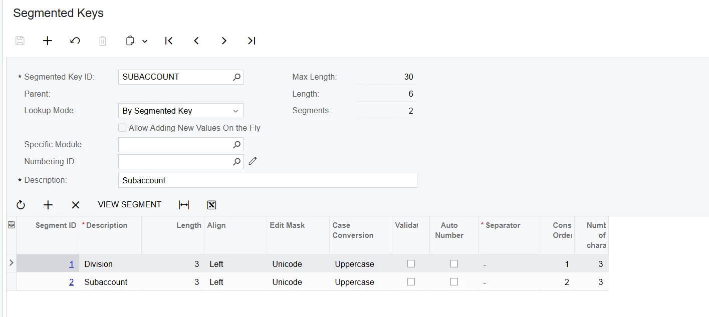 The rule of composing the subaccount from other subaccounts associated with the records related to the billing document for a service order or appointment of this service order type. (You should make sure that the subaccounts have been defined for the sources of the segments.) To set up the rule, select a segment, press F3, and select the source of the segment value, which is one of the following options: