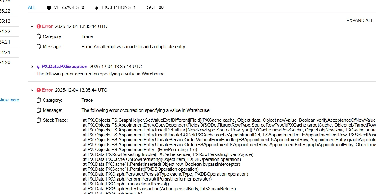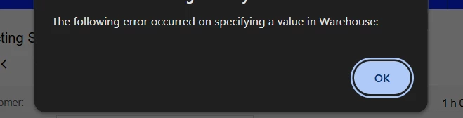 We need to add one line item to the appointment. After adding the item, it can be included in the appointment; however, when we click on save, an error occurs that states, "The following error occurred when specifying a value in Warehouse.