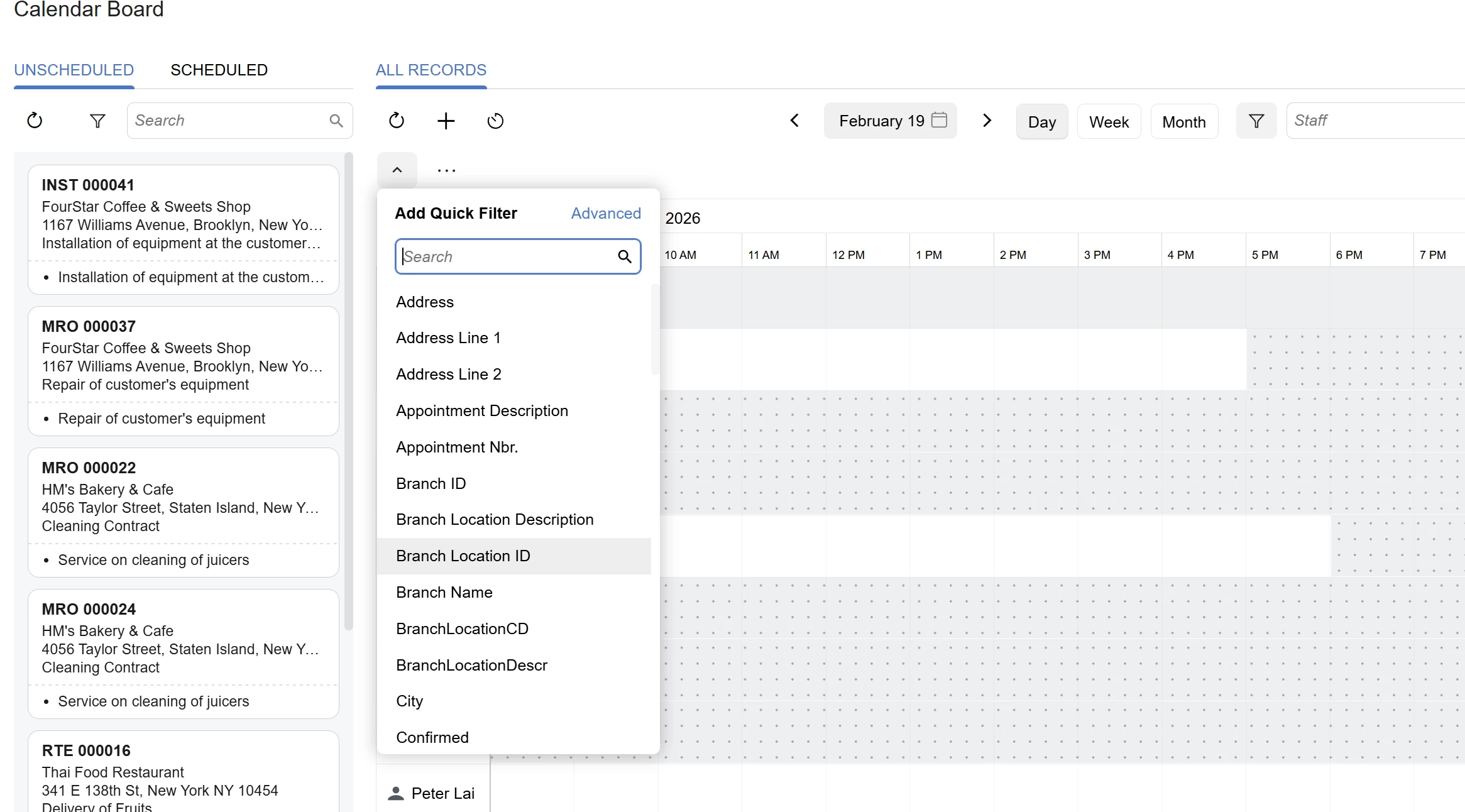 In the Modern UI Calendar Board, the Quick Filters list is system-defined and cannot be extended through standard customization. Workflow Stage is not available because the filter panel is hardcoded to specific fields exposed by the screen.