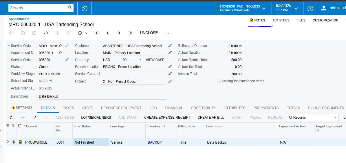 Notes can be added to the service order, and notes from the service order can be copied to the appointments.