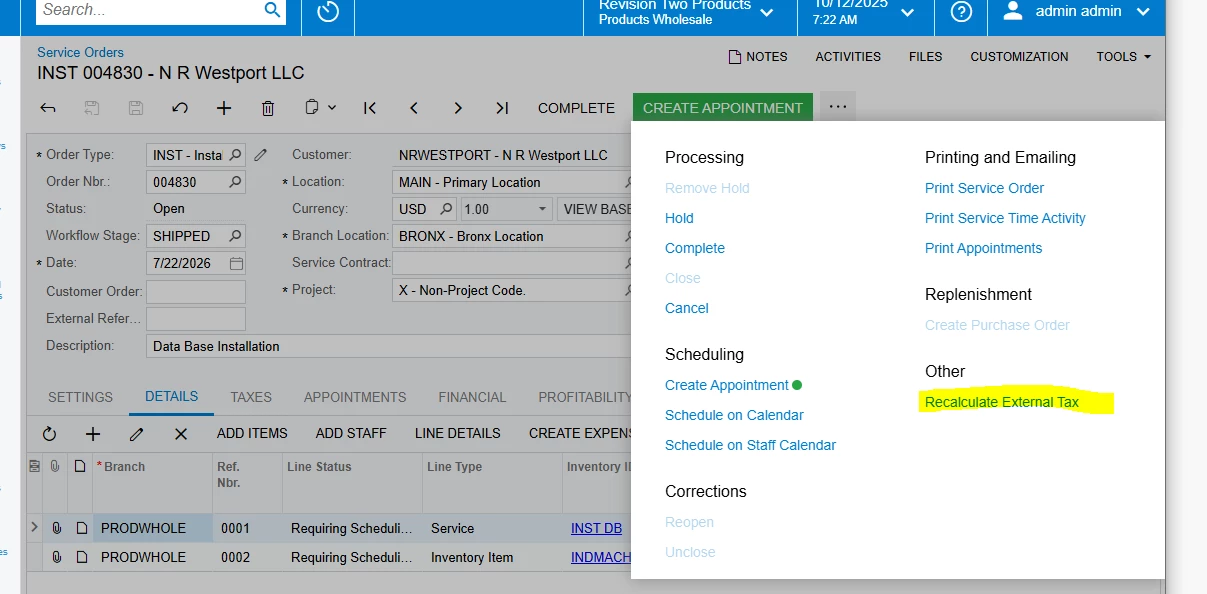 We are getting a warning, ‘taxes not up to date’ in Field Services (Service Orders and Appointments). We are using Avalara as the external tax provider. If we try to close the order or appointment, we get a actual error “Failed to get taxes from external tax provider.”