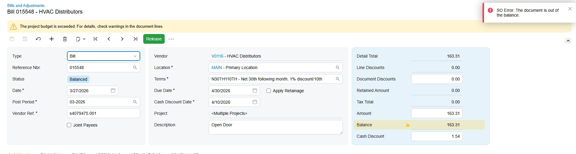 Here’s our issue since upgrading to 2025 R2: This invoice is giving us the strange error message ‘SO Error: The document is out of the balance.