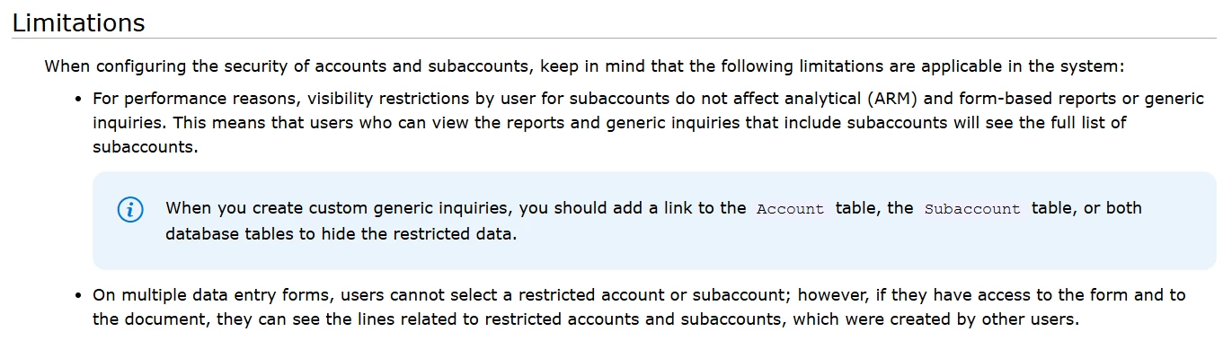 “your organization may have sensitive or confidential accounts and subaccounts which must be invisible for majority of users. You can control the visibility of these accounts and subaccounts for users (that is, -which users can view the accounts and subaccounts) by using restriction groups.”
