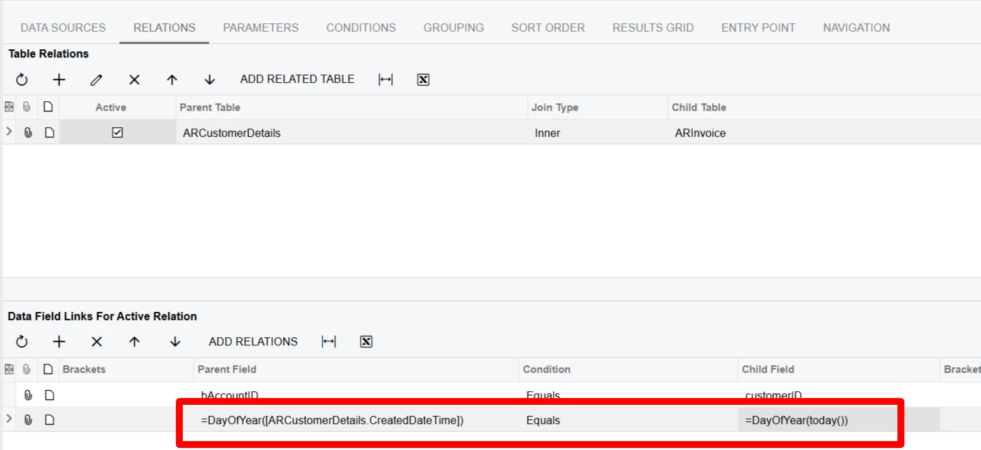 =DayOfYear([ARCustomerDetails.CreatedDateTime]) Equals =DayOfYear(today())