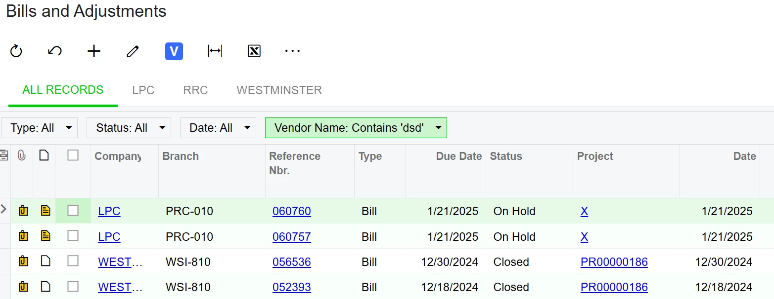 We have added the Project field (APInvoice.ProjectID) to the Bills and Adjustments primary list and here is an example of what we see: