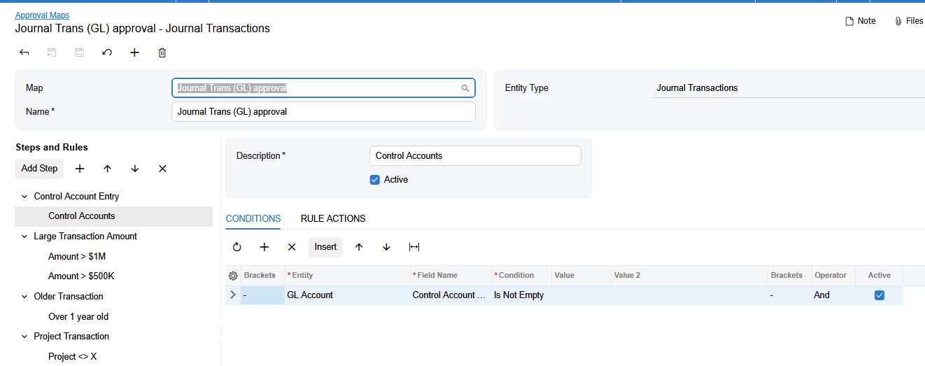 An example of Journal Transaction Approval maps can be found in the Sales Demo tenant provided by Acumatica as a test environment, shown next.  Many helpful videos can be found on YouTube.