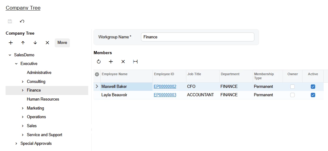 • Create Approval Map linked to Journal Transactions screen using Company Tree WorkGroups for assignment (versus employee names)