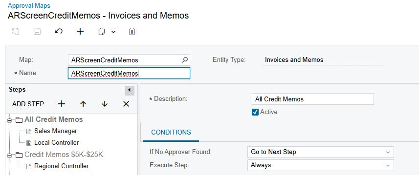 i am just wondering how can i set properly the workflow for approving credit memos, so that Sales Manager will always be the first to confirm new credit memo. Right now our AR map for credit notes is the Sales manager on the top and then the local controller, but in reality is other way around. The first the crontorller is getting the memos and then sales manager. Do you know maybe what is causing this flow?