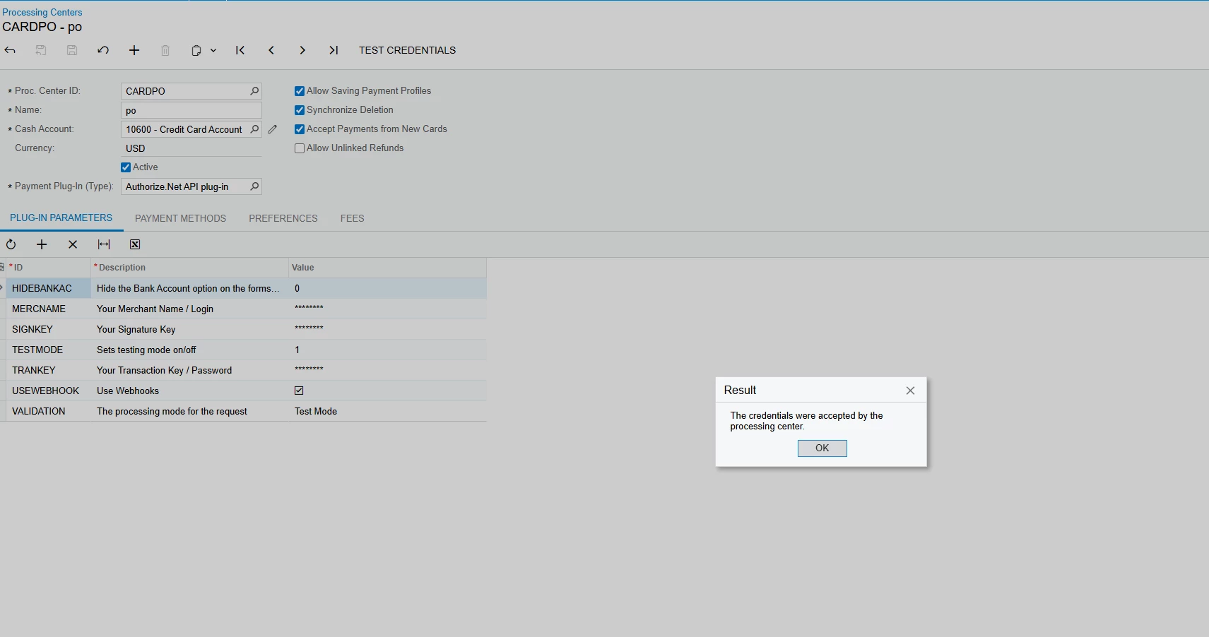 PX.CCProcessingBase.Interfaces.V2.CCProcessingException: One or more of the following settings have not been specified: the merchant API login ID, the transaction key, the test mode, the validation mode.