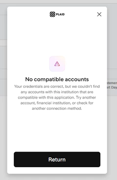 Encountering the same experience with another client. We can by pass credentials and MFA security but receive the same prompt -- No Compatible Accounts. MX would not authenticate.