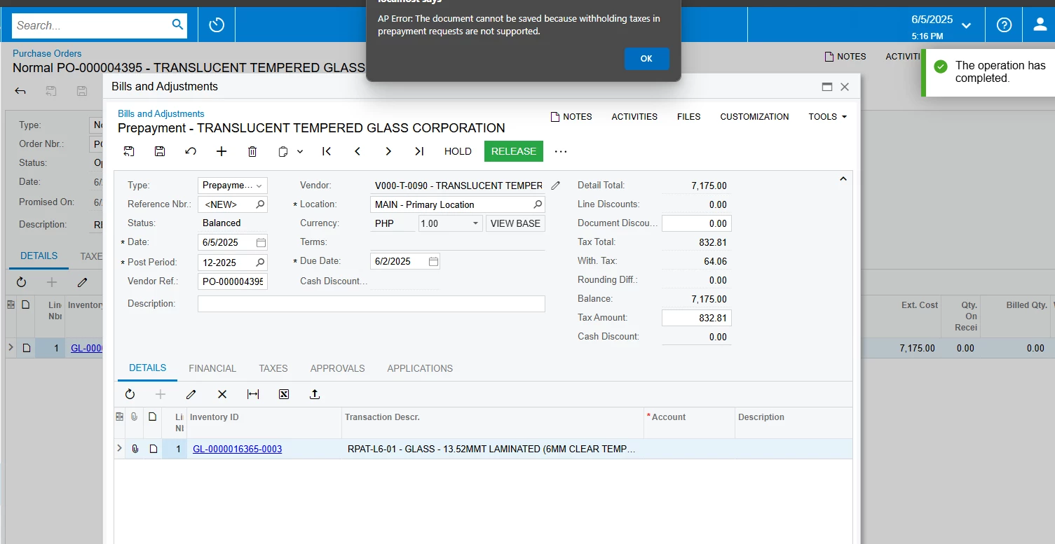 Error Message: “Cannot save document. Withholding tax exists in prepayment request.”