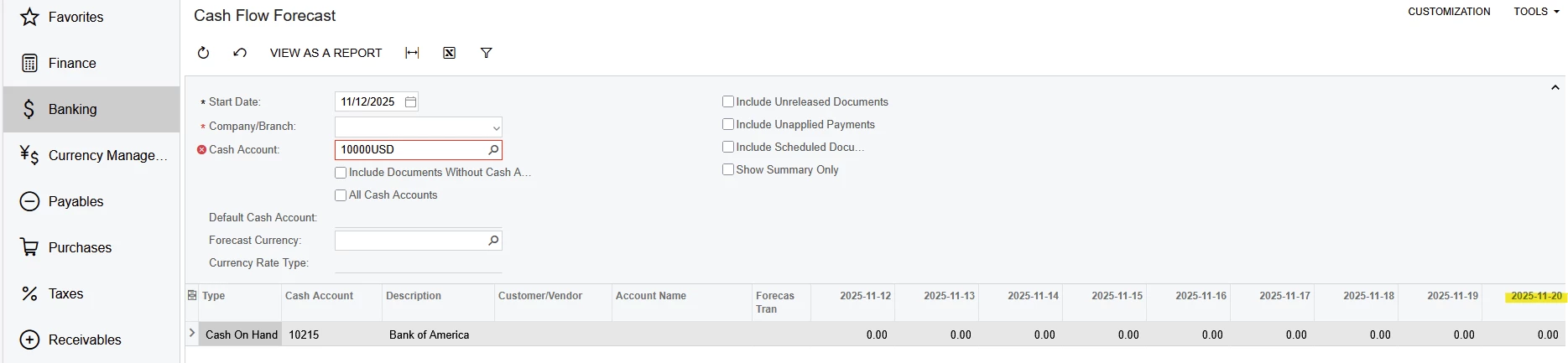 I want to be able to say, how much will I have on 11/20/2025 based on the balance of today, any due AR and AP, and any future AR and AP that has not been paid yet.