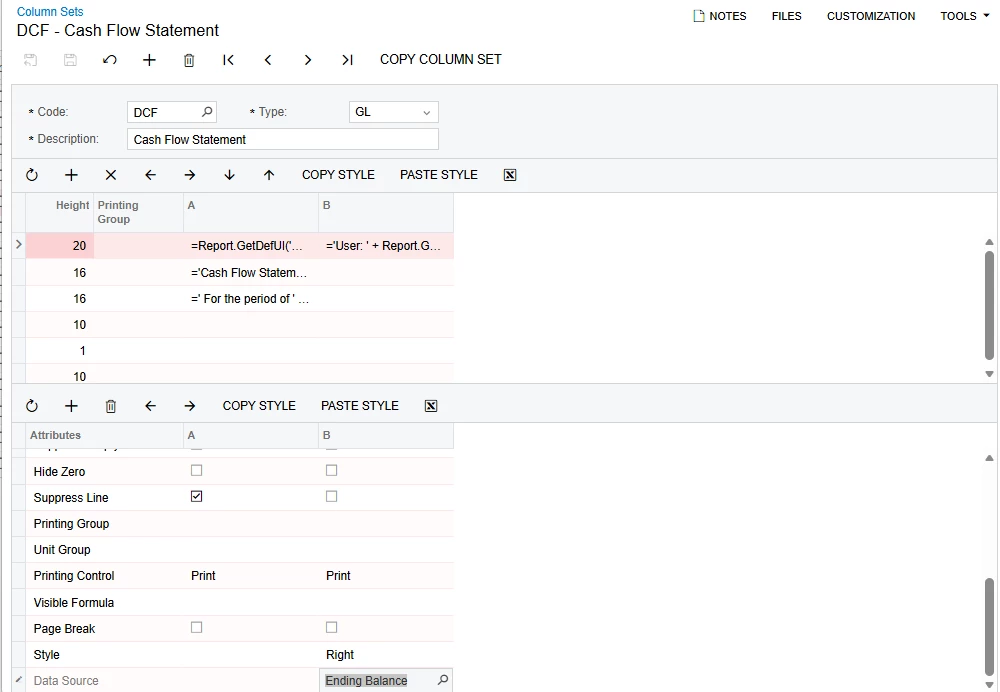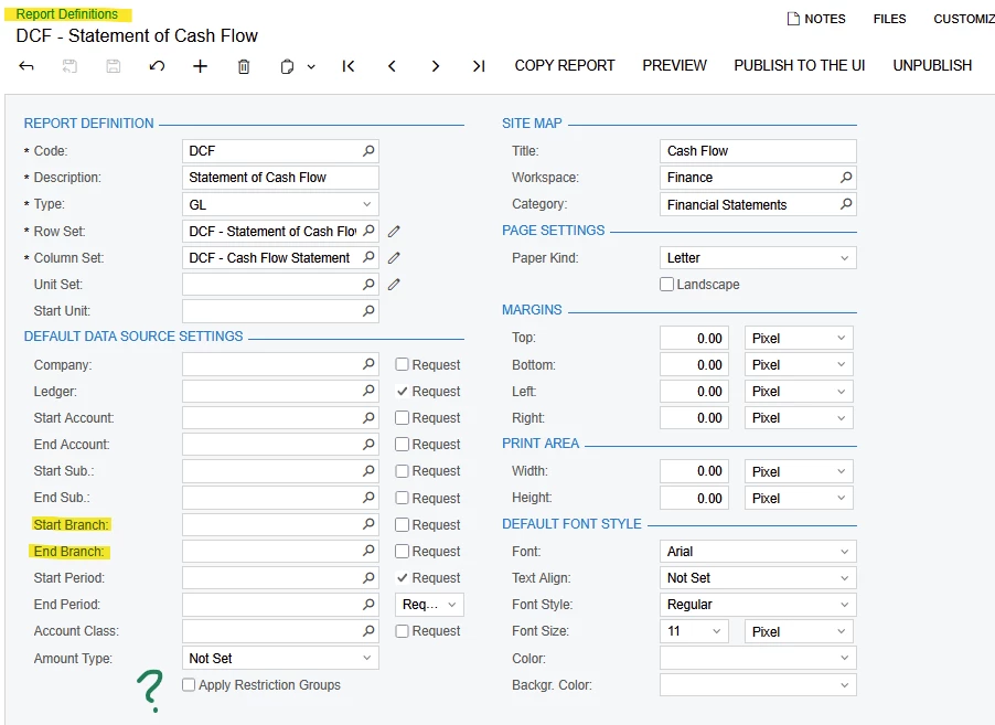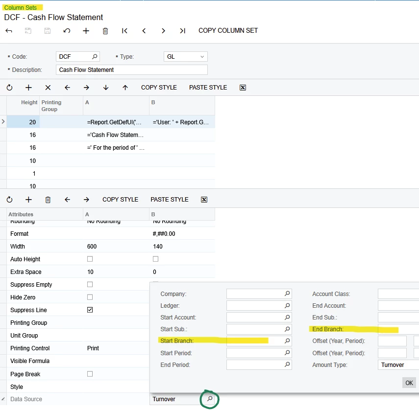 Hello! I am working on my cash flow statement to combine all branches to show ending balance through specified periods. I am not able to determine why not all of my branches are pulling into the rows - below are the setting I have currently… some lines are matching I assume to not having activity in other branches or post periods...any thoughts or ideas are welcome!