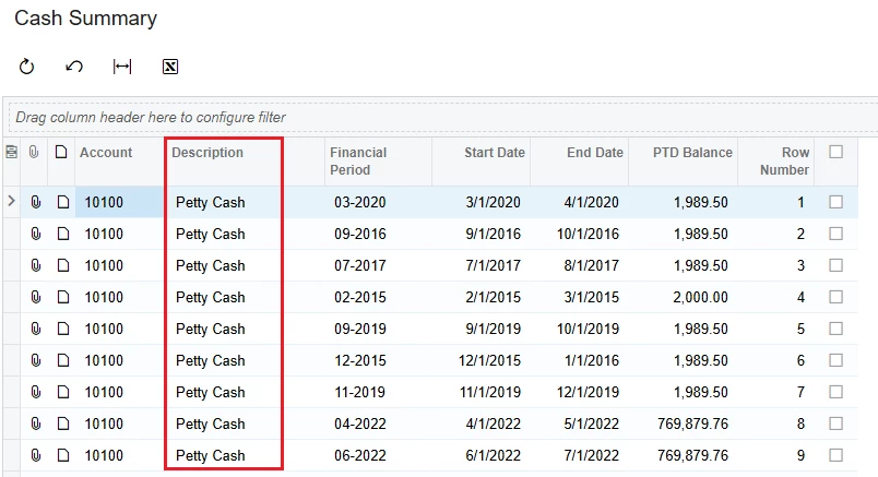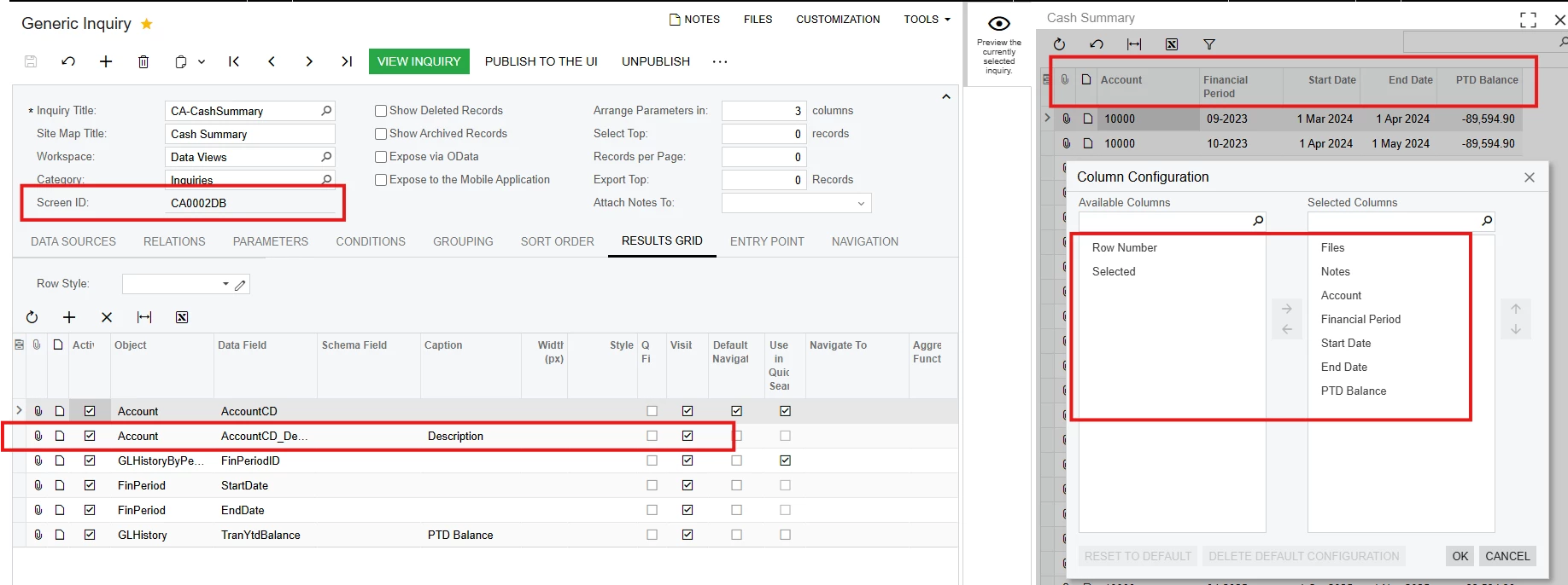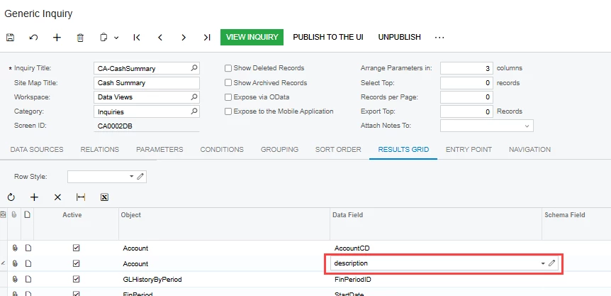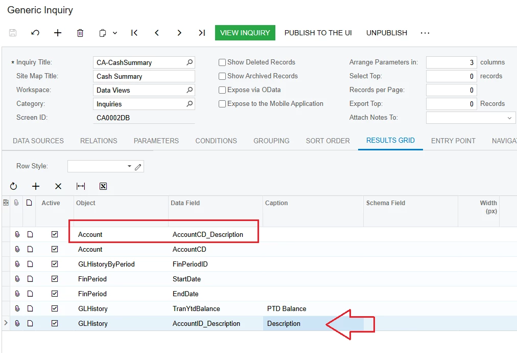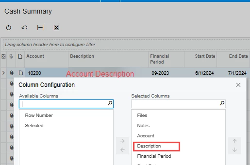While exploring the Controller dashboard I tried to modify the Cash Position widget to display the Account Description instead of the Account Code. I took at look at the underlying GI, CA0002DB, which has the Account Description selected, active, and visible. However, when you view the GI results the Account Description does not appear and it is not available in the Column Configuration window.