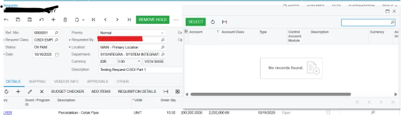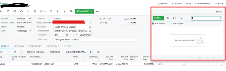 Hi, i want to create a request but the while i try to select one of the chart of account and subaccount form on of my item request, there’s no option to selected the COA and Subaccount. I already import the COA and also create the Subaccount. There’s any step that i miss while i config?