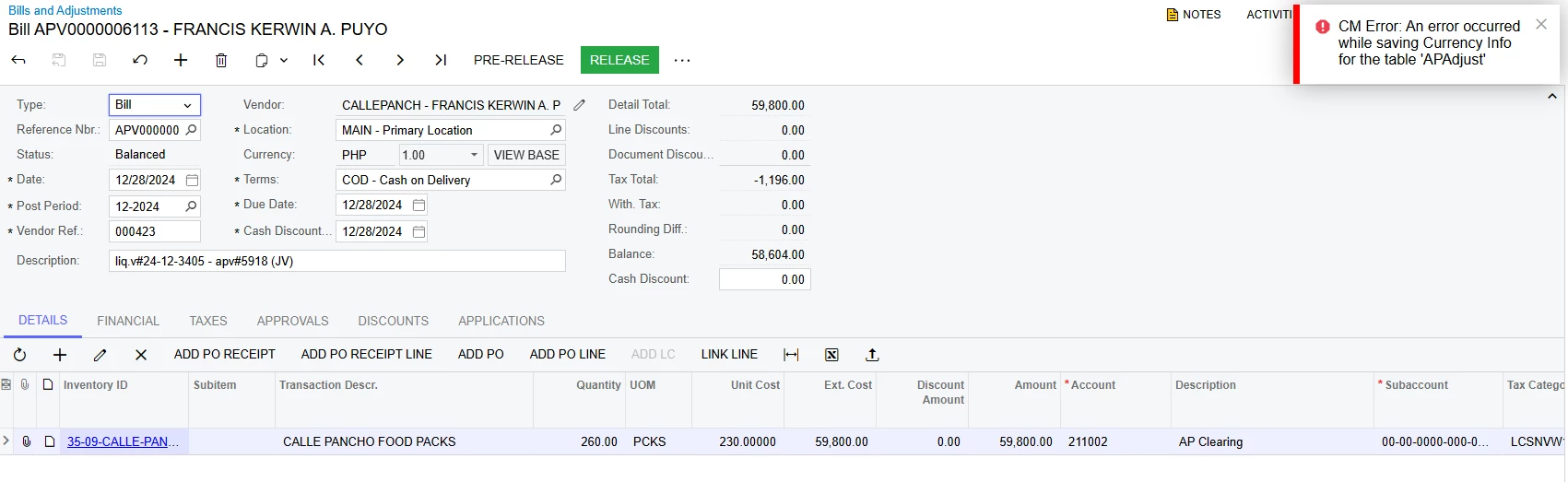 Can anyone give me insight about this kind of error in AP Bill module - CM Error: An error occurred while saving Currency Info for the table 'APAdjust'