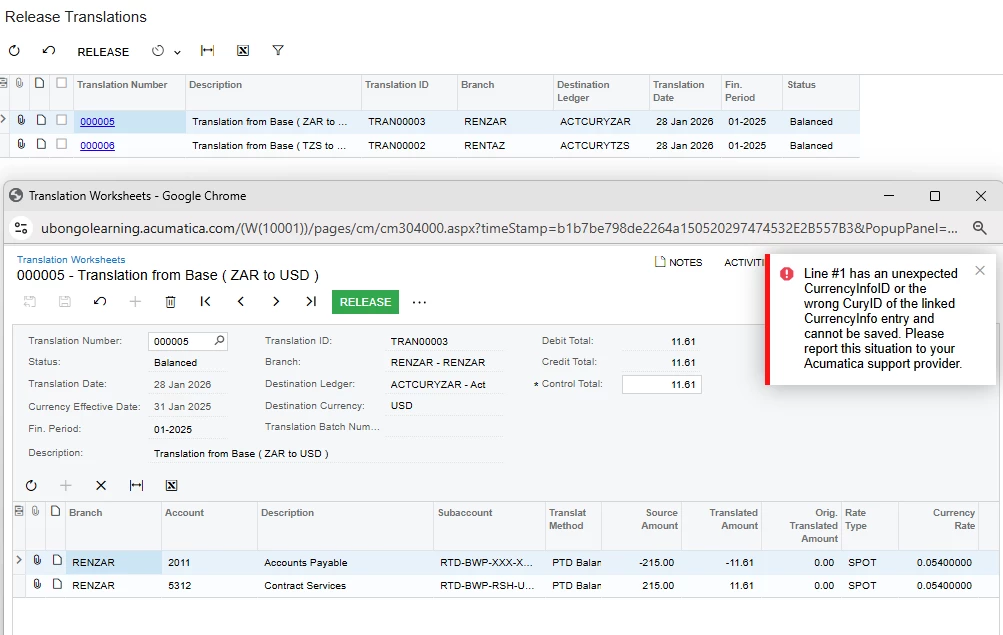 Line #1 has an unexpected CurrencyInfoID or the wrong CuryID of the linked CurrencyInfo entry and cannot be saved. Please report this situation to your Acumatica support provider.