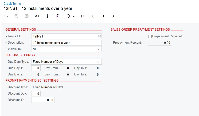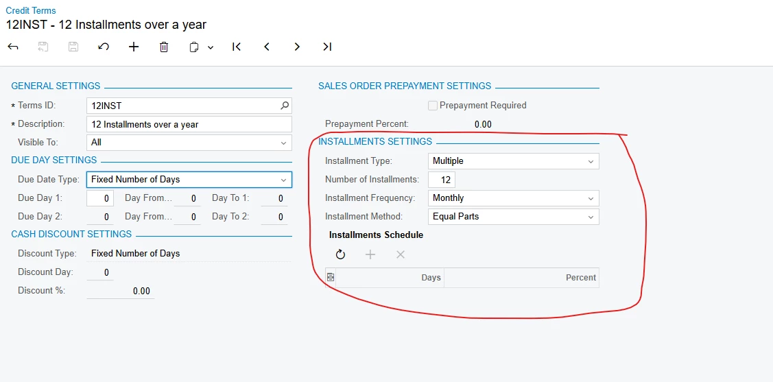 What release/build of Acumatica are you on? Do you have full access rights to that screen? It may be so that Access Rights to that section are removed for your user. I can’t find any feature controlling either the Installments are allowed or not.