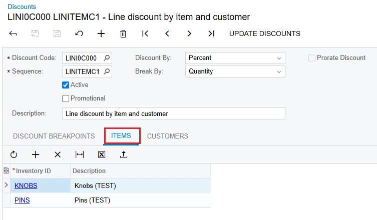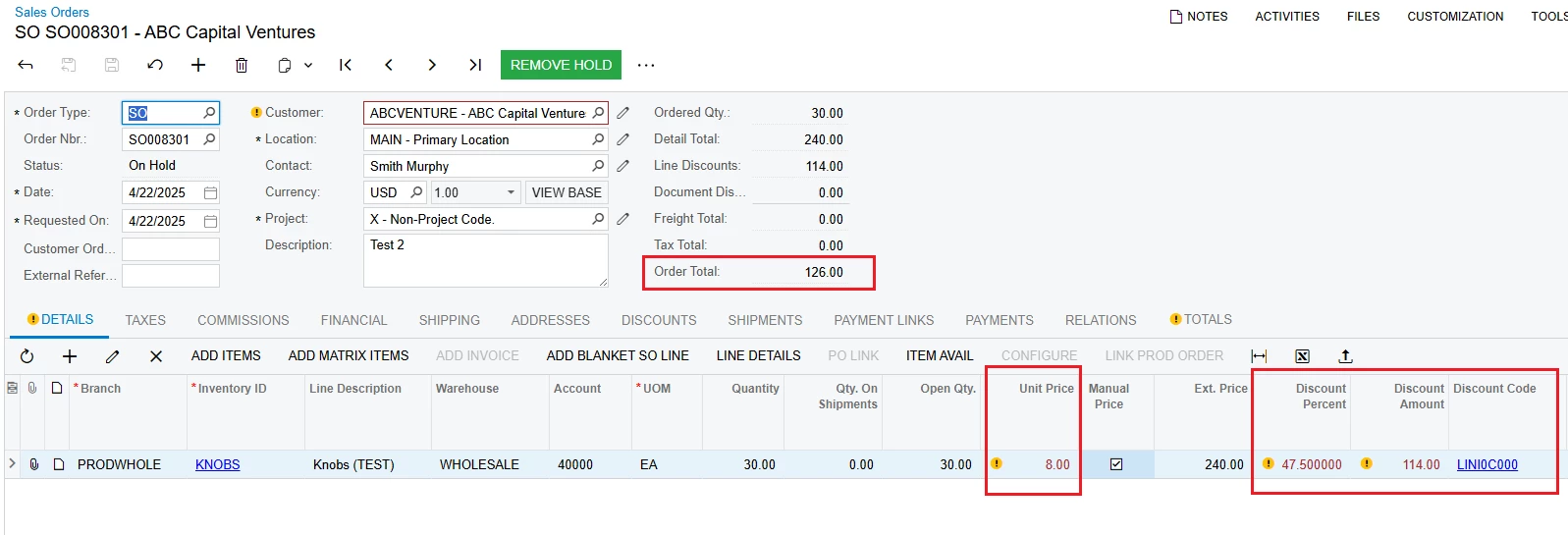 Scenario: Customer orders 100 pins at $2/EA (40% off $5 per unit for a total $200) and 30 knobs at $4/EA (50% off $8per unit for Total of $120)