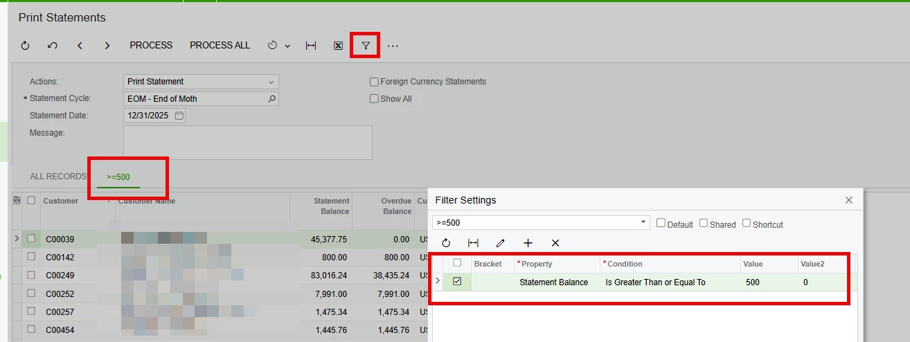 On the Print Statements (AR503500) screen, I simply added a filter and applied it to the Statement Balance field. Has anyone else in the community managed thresholds like these for customer statements? If so, what things did you do to accommodate this?
