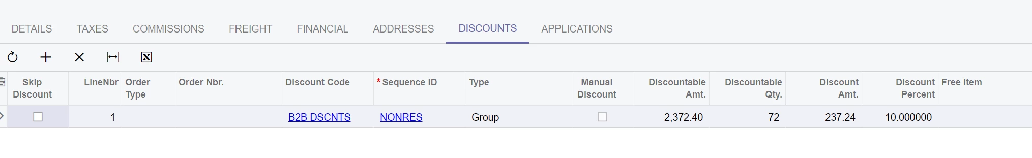 Our Sales Order with multiple lines has a total amount that initiates one of the discounts we’ve setup (i.e. >2500 = 20% discount).