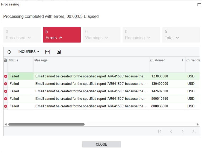 Email cannot be created for the specified report 'AR641500' because the report has not been generated or the email settings are not specified.