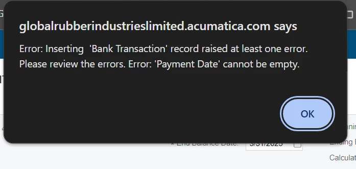 When attempting to save or process a bank transaction record under “Import Bank Transactions” in Acumatica, the system displays the following validation error: