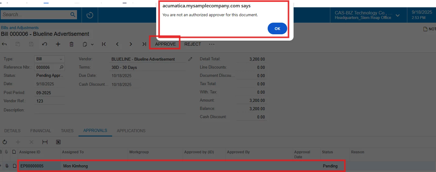 Dear Supporters, I don't know why my set up approval have problem the user approval can't approval on the bill. Please kindly advise and Thanks in advance for support.