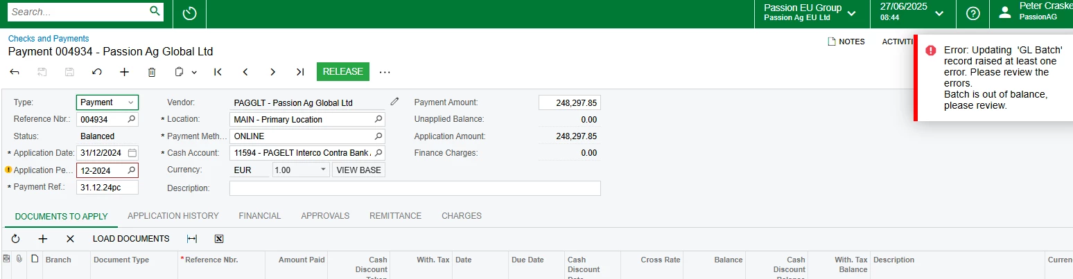 When trying to release an AP batch I get an error: Updating 'GL Batch' record raised at least one error. Please review the errors. Batch is out of balance, please review