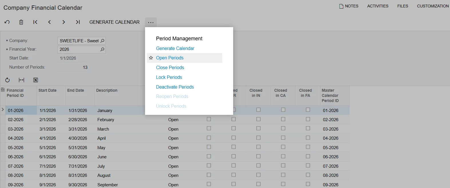 I generated periods for 2026. When I try to open them on Manage Financial Periods, 2026 is unavailable for selection. I’m in the Sales Demo environment, but I don’t think that should make a difference.