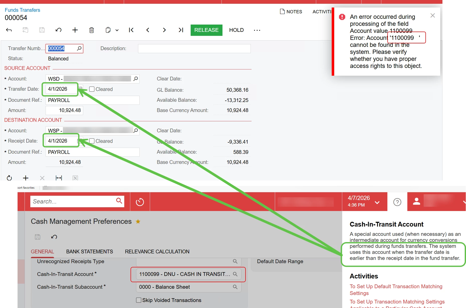 As a background, our customer has their chart of accounts significantly restricted by Branch. I know I can simply grant more visibility to the account in question, but I’m curious why I’m getting the error in the first place. Our customer (not live) is attempting to release a Funds transfer, and the system is attempting to reference the Cash-In-Transit account from the Cash Management Preferences, but the criteria for using it only states that it’s when the Transfer Date precedes the Receipt date. This is not the case in this transfer. I’ve also attempted this with the business date equal to the Transfer Date and got the same result.