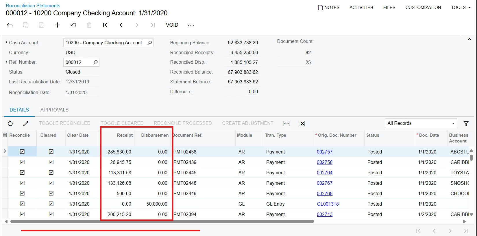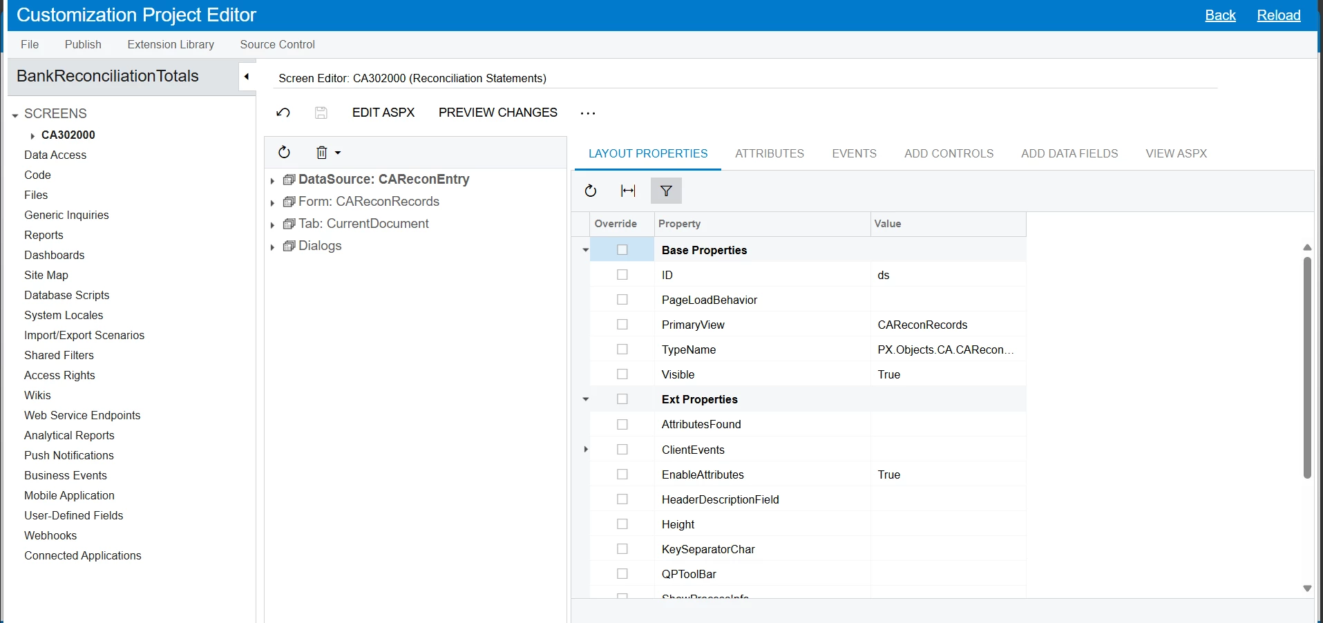 I am working with Acumatica 2024 R2 in Reconciliation Statements screen. I need to add totals of receipts and disbursement in detail section as a footer. I am supposed to make those updates in the detail grid of the Customization Project Editor, but there is no detail grid available. I am new to this kind of configuration. Please show me a detailed method.